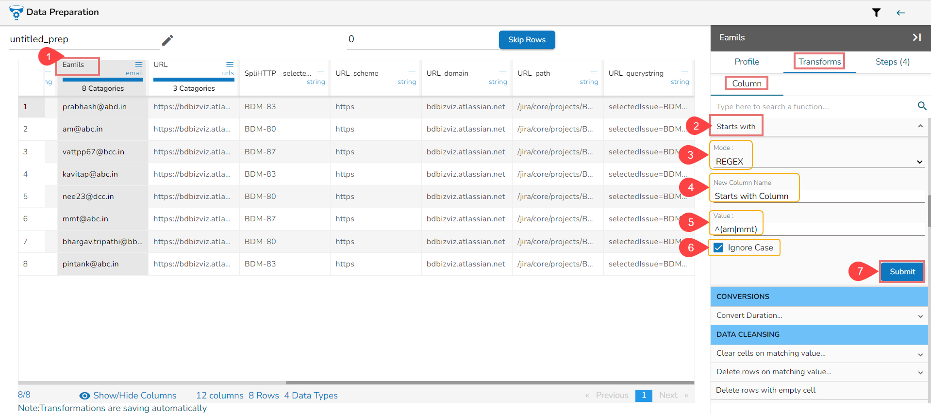 <figure><img src="https://content.gitbook.com/content/j2SqA9Ec9HkYsyrU85qy/blobs/XhlWARKmR0VcgMmbOcZj/Startswith.gif" alt=""><figcaption><p><em><strong>Using the Starts with transform</strong></em></p></figcaption></figure>