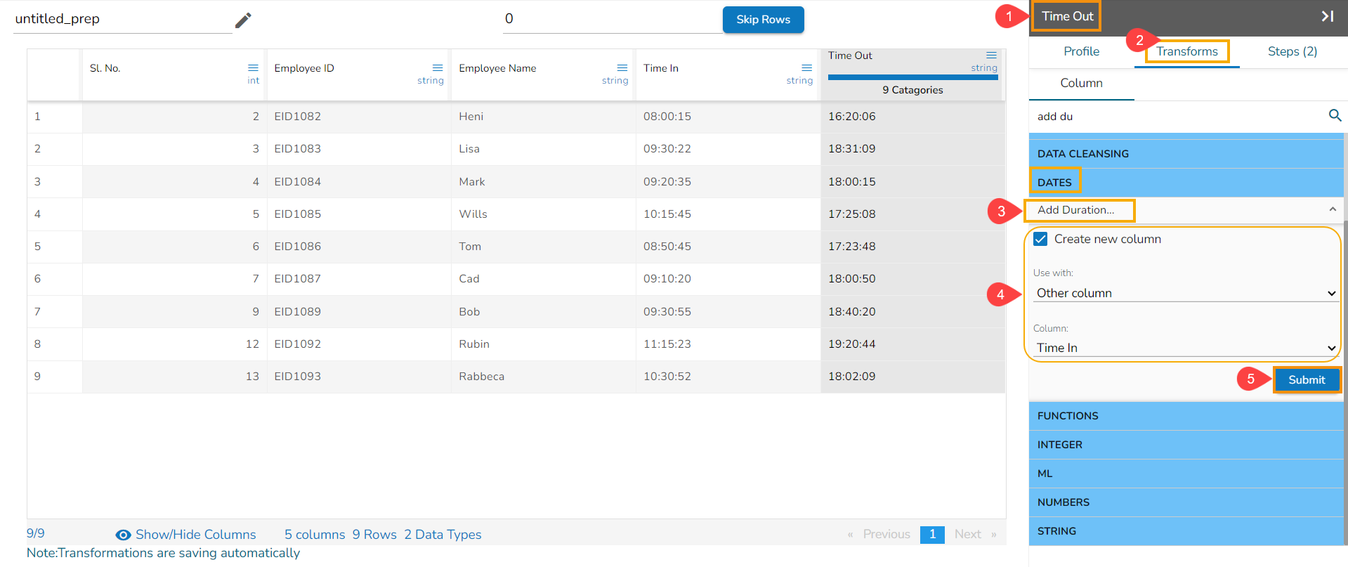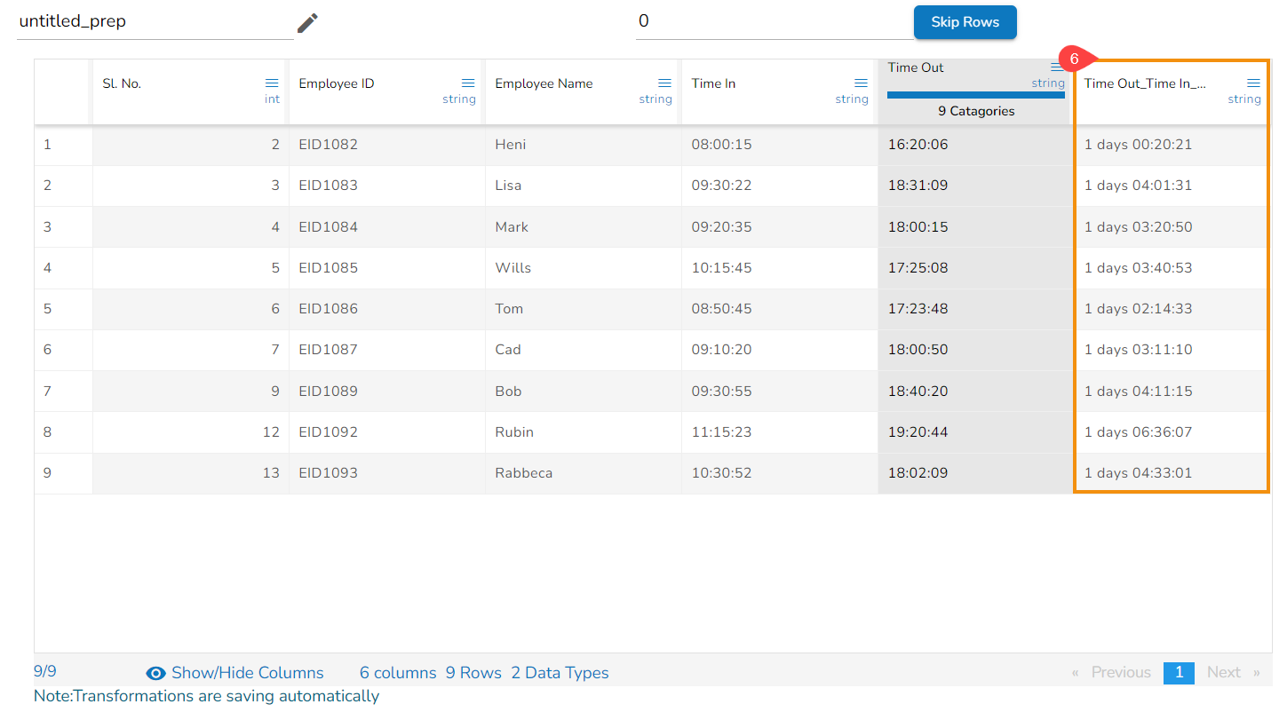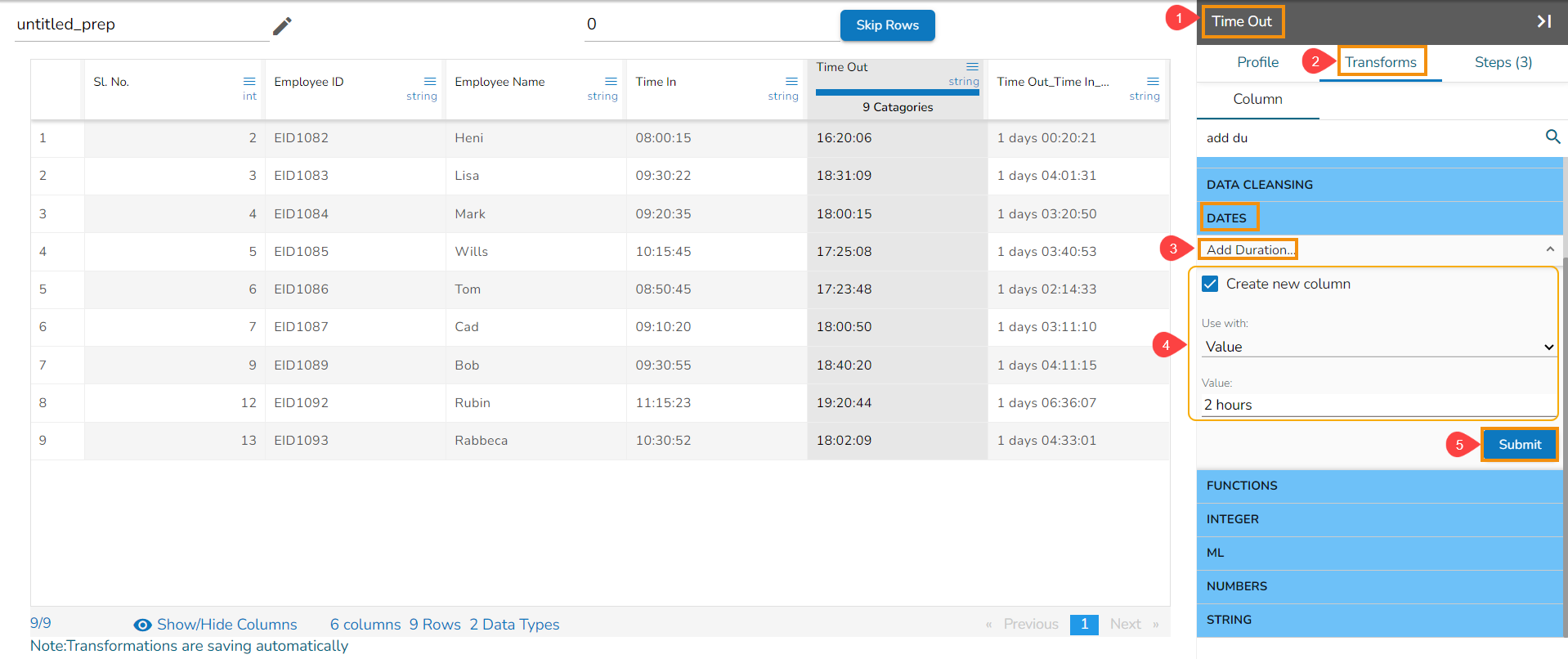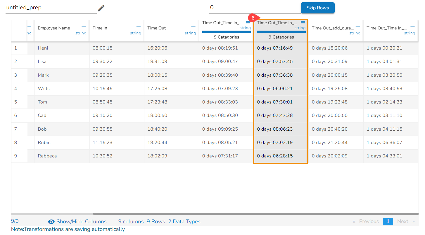 The Subtract Duration transform has been applied to the Time Out_Time In_sub_duration_1, the selected value is 01:03:02,