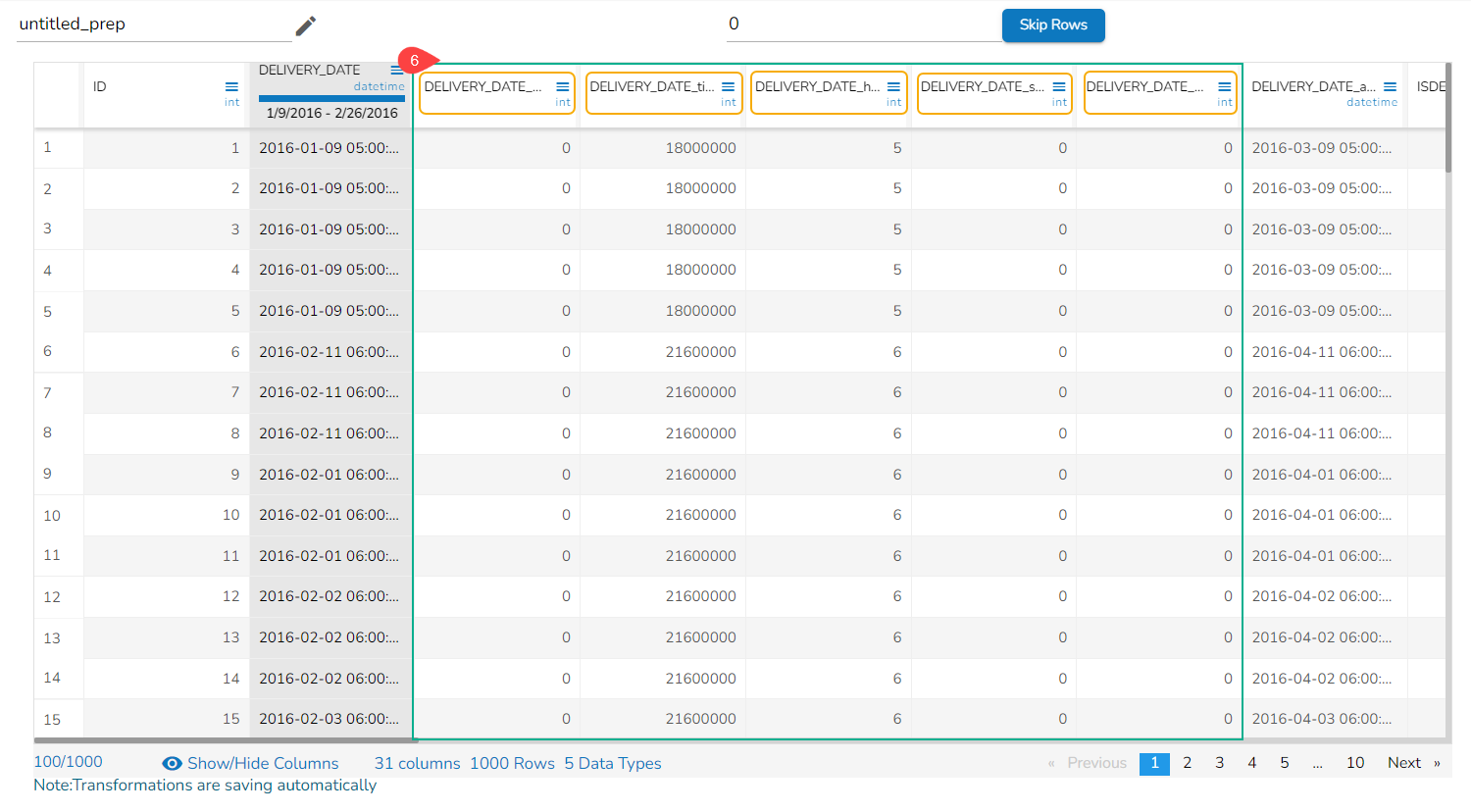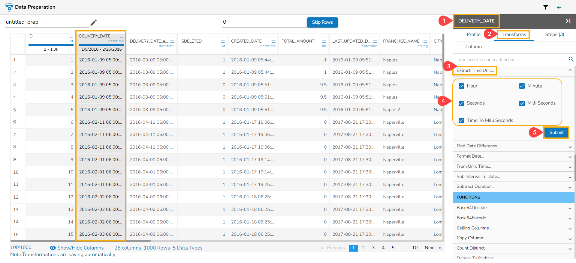 The Extract Time Unit transform is applied to the DELIVERY_DATE column selecting all the available format types: