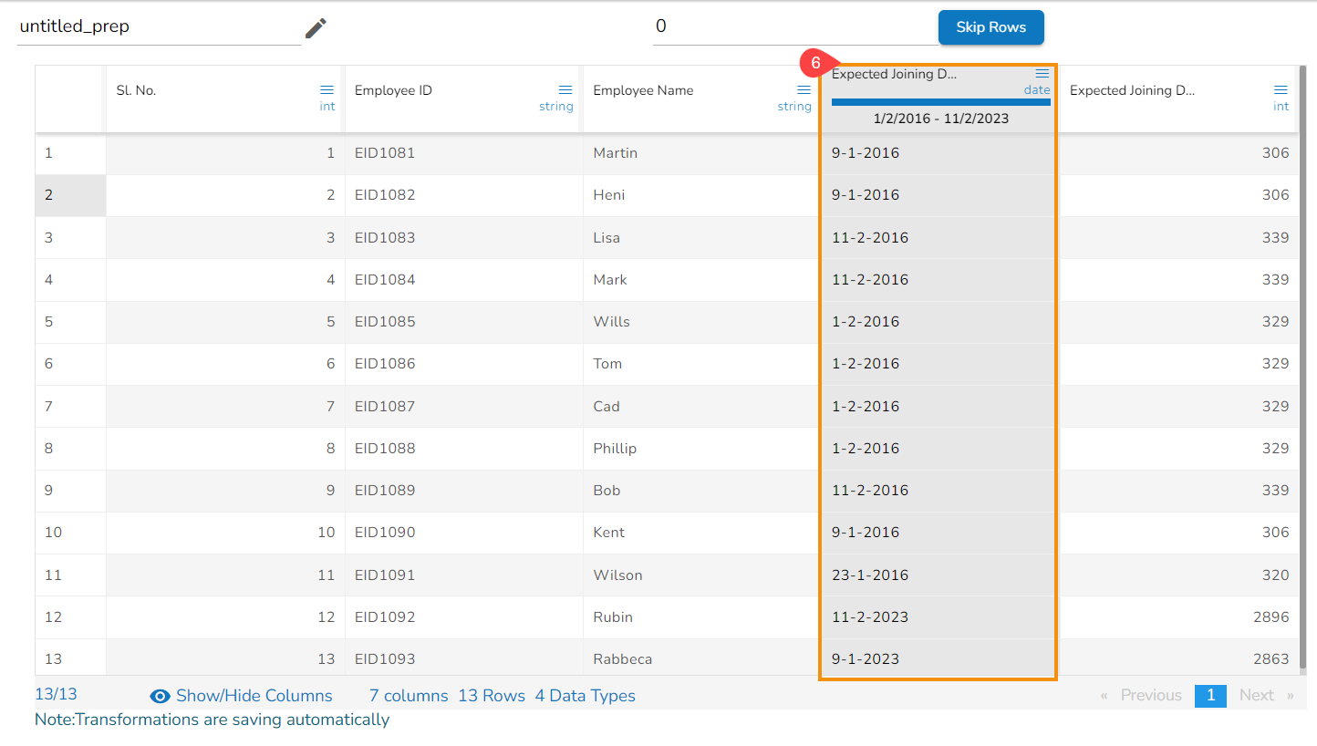E.g., This transform is applied on the Expected Joining Date column by selecting the Day of Week as a part to be extracted from the selected column values.