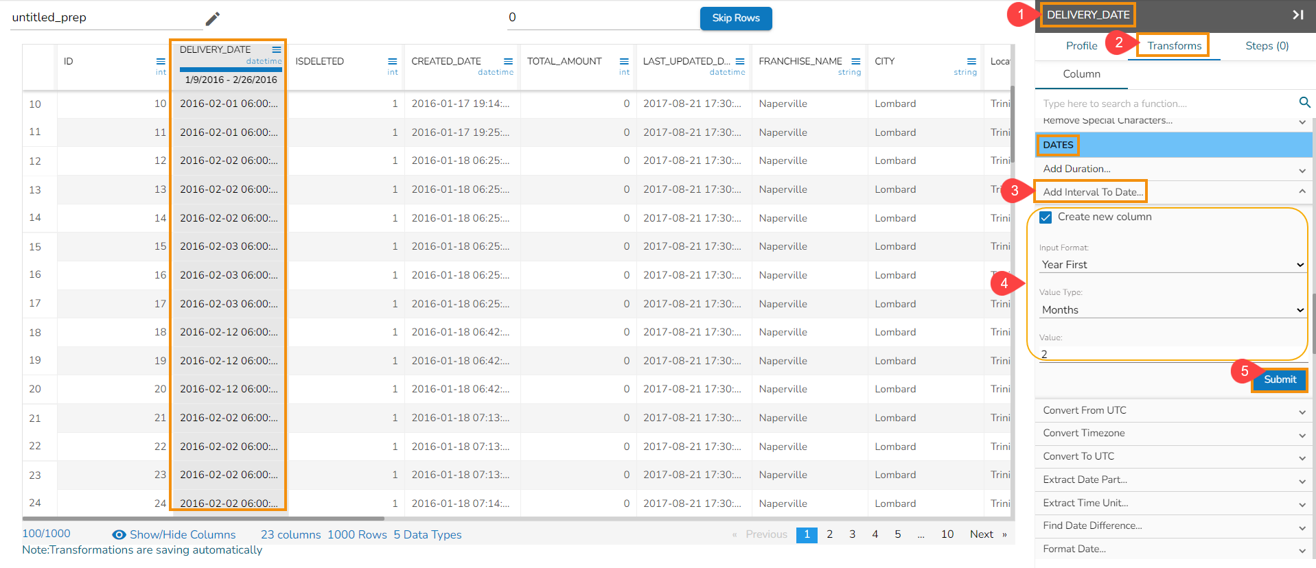 E.g., The Add Interval to Date transform has been applied to the DELIVERY_DATE with the selected value of 2 months,