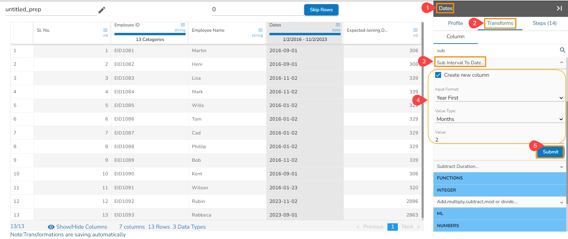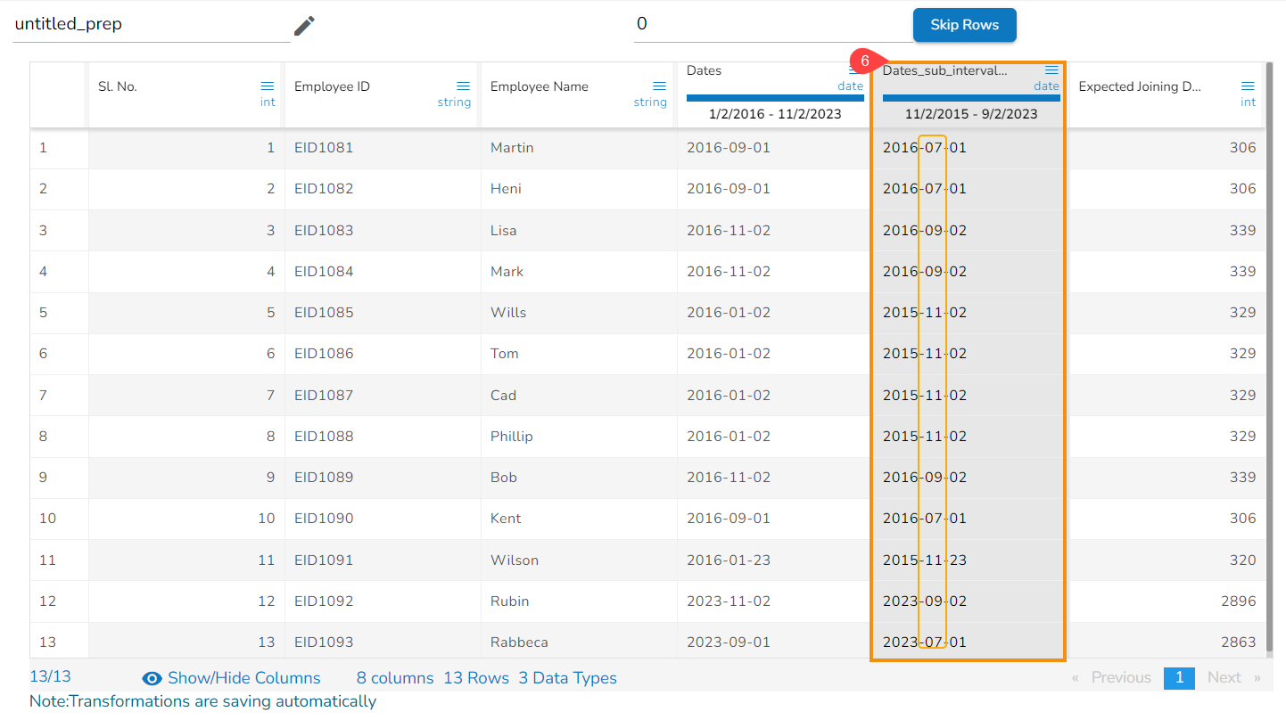 E.g., The Sub Interval to Date transform is applied on the Dates column with the 2 months as value to get Sub Interval to the given date.