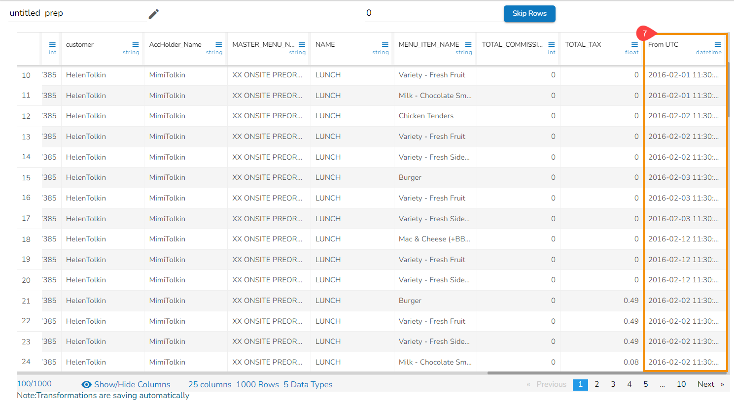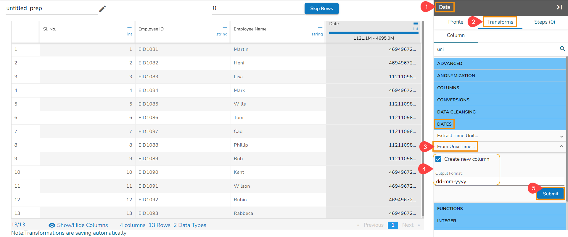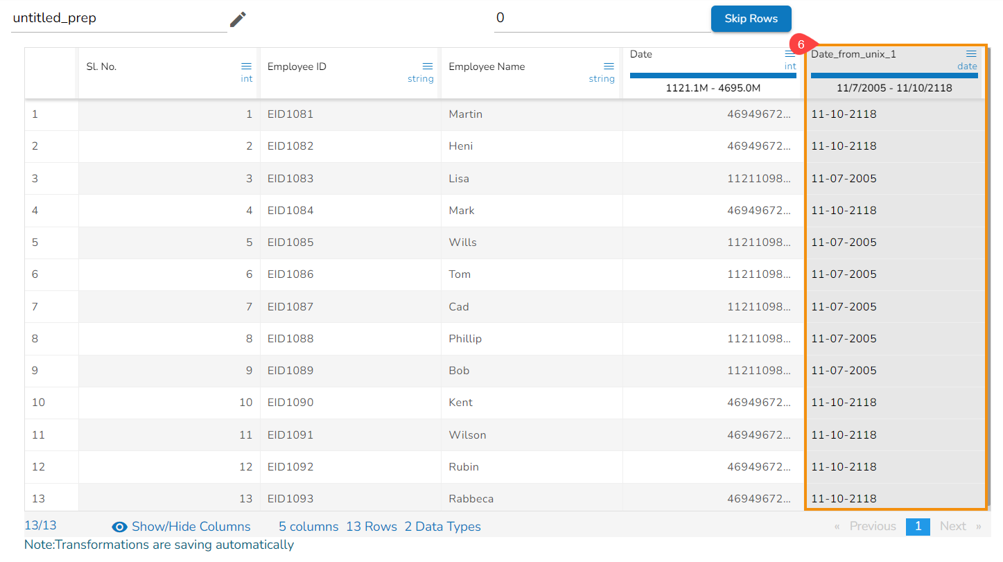 The From Unix Time transform converts the Unix time into a specified format. The From Unix Time transform has been applied on the Date column that contains the values in the Unix format,