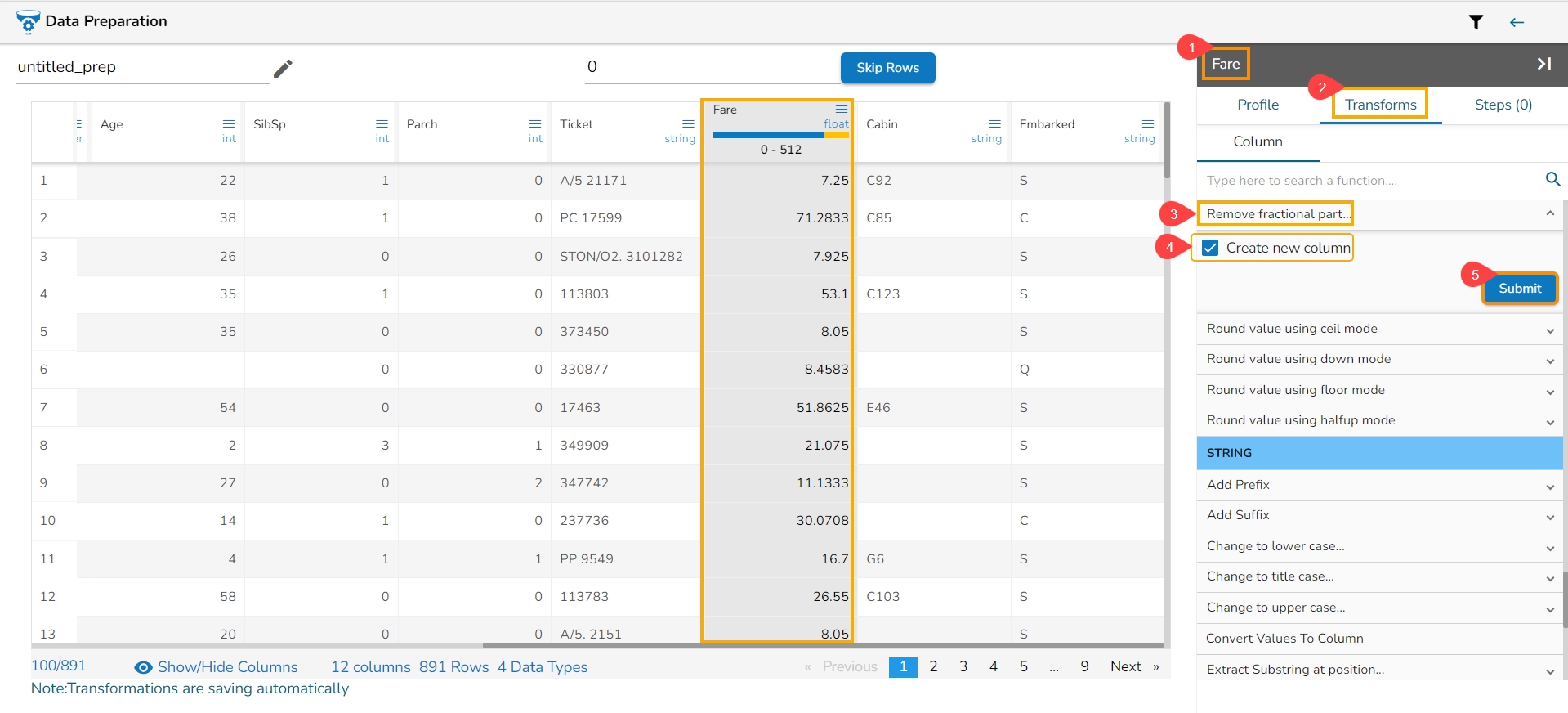 The Round Value using Half-up mode transform is applied to the Fare column as displayed below: