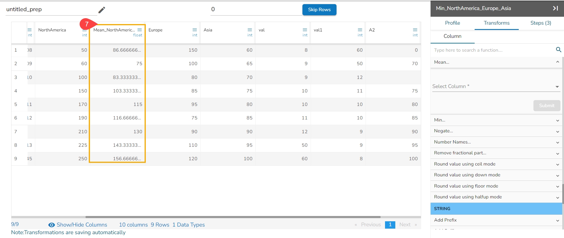 The Mean transform is applied to the North America, Europe, and Asia columns as displayed below: