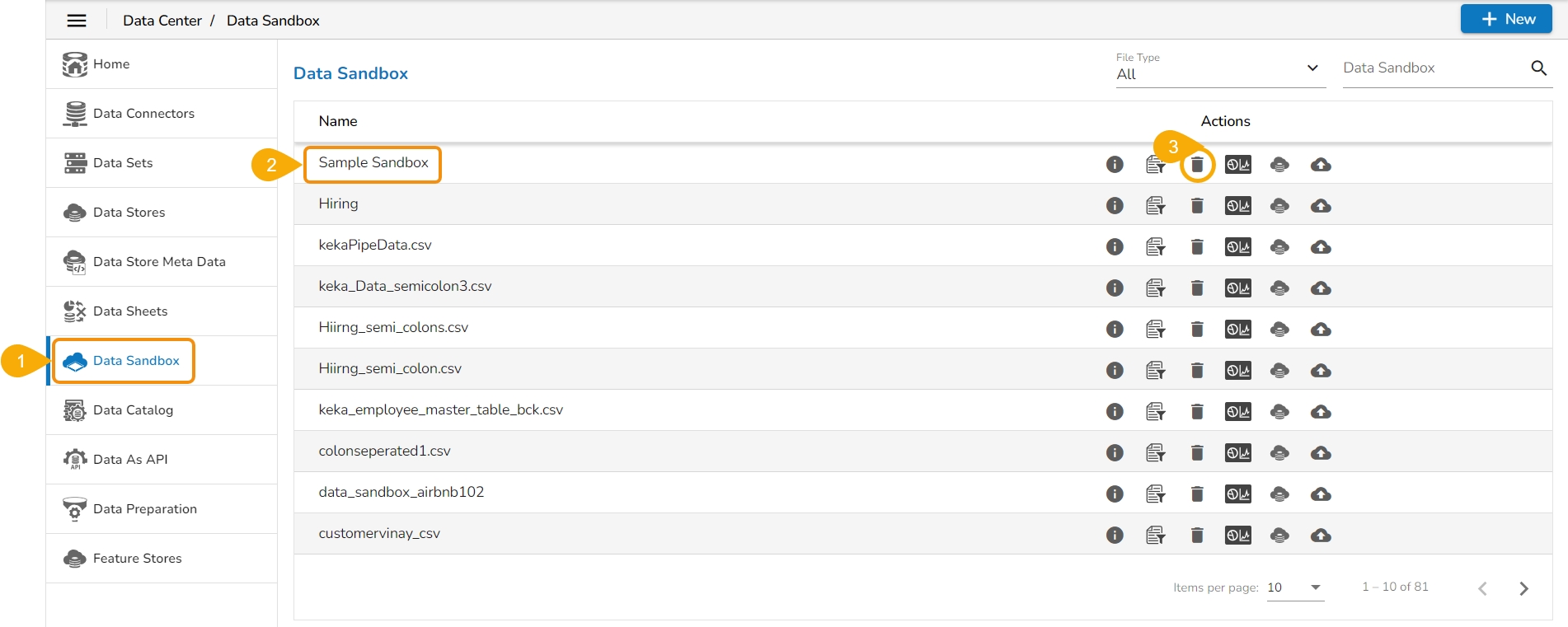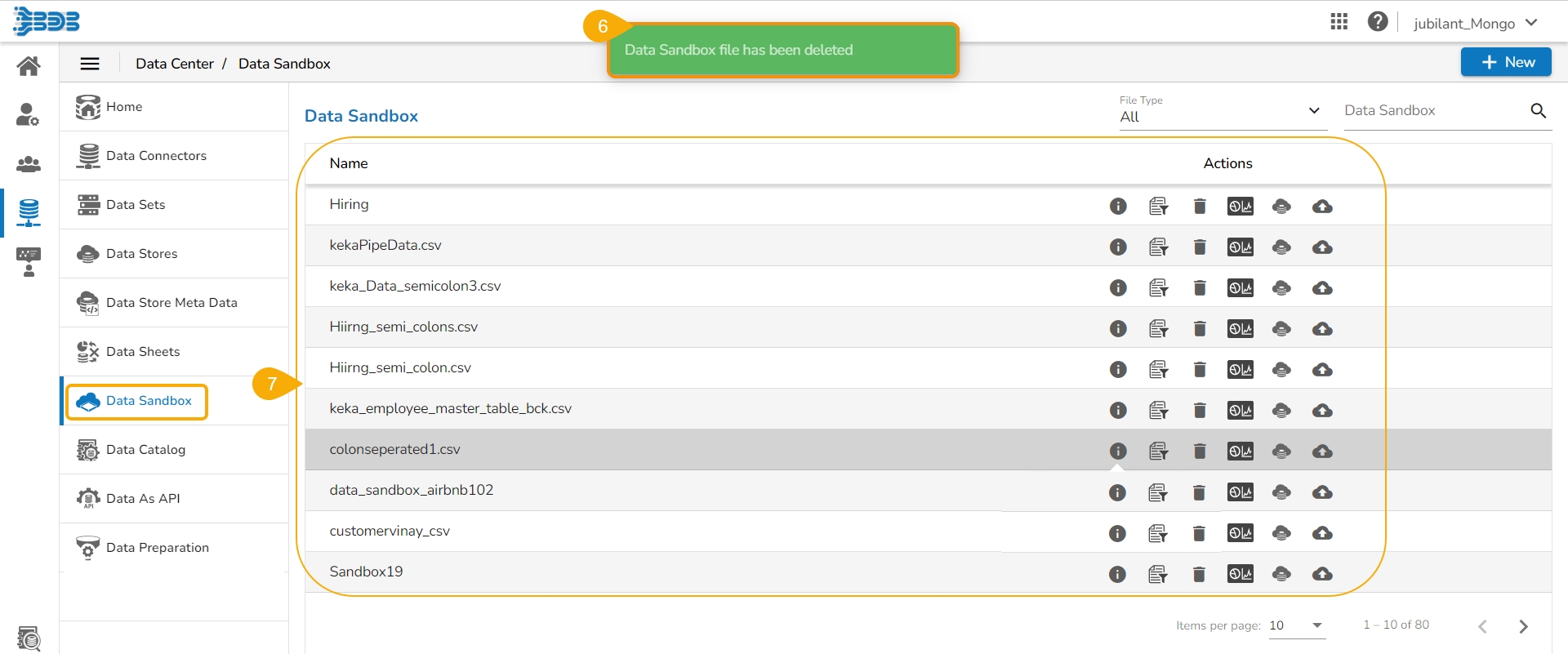 A notification message appears to inform about the deletion of the selected Data Sandbox entry.