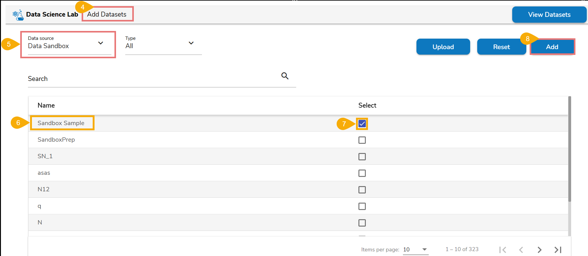 The Add option appears on the Add Datasets page only after selecting a Data source (For the given example, it is a Data Sandbox).