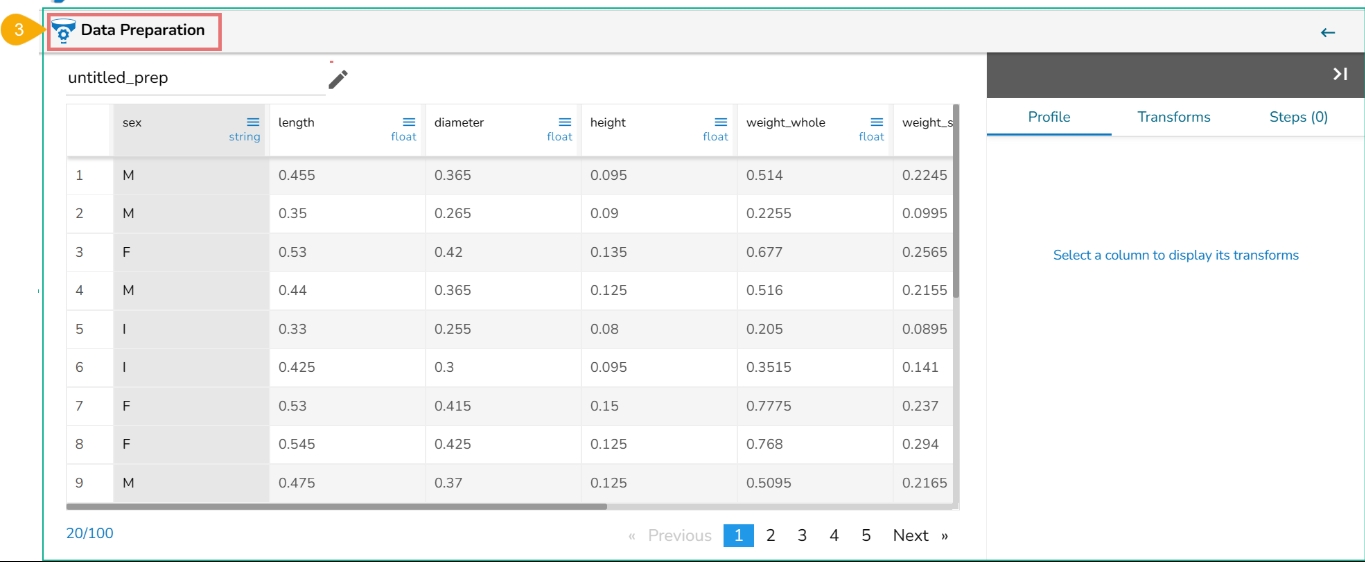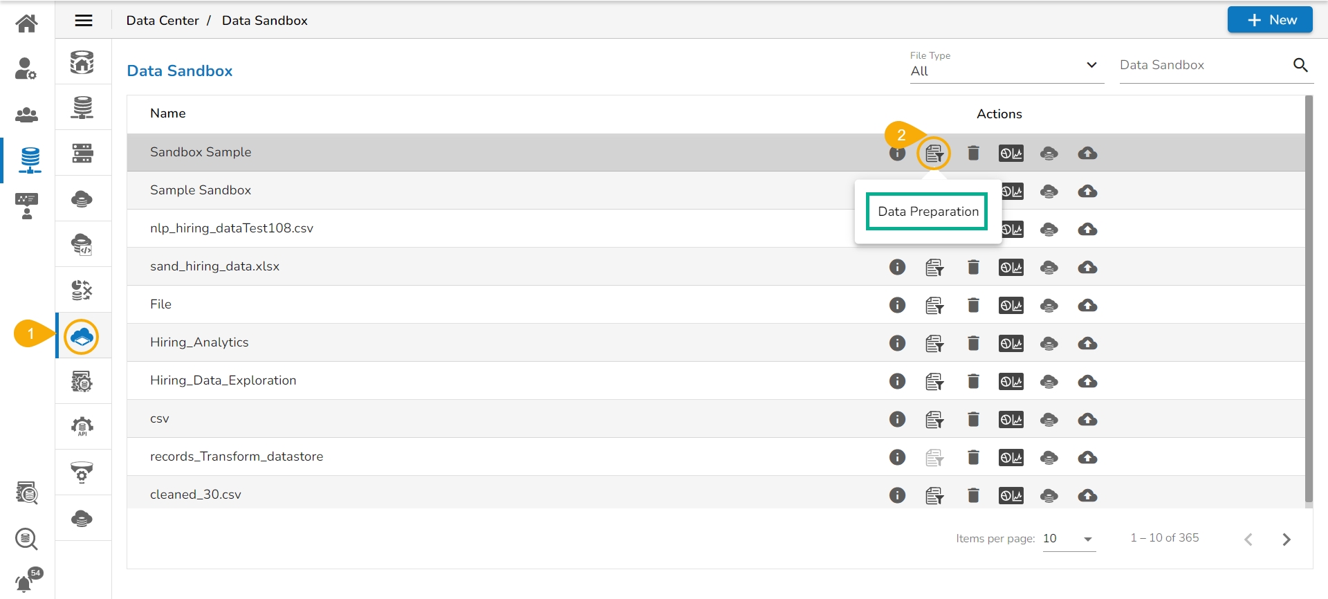 This page displays steps to avail the Data Preparation workspace for a selected Data Sandbox file.