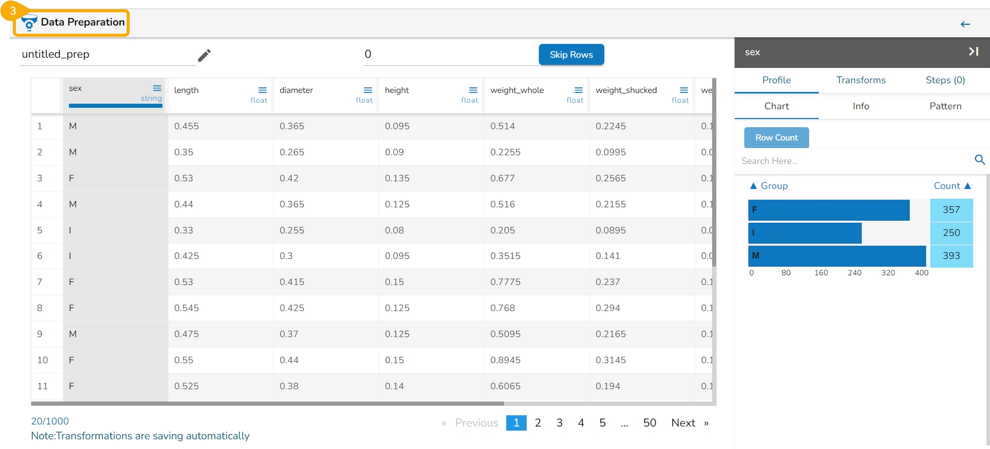 The data of the selected Data Sandbox file opens in the Data Preparation workspace.