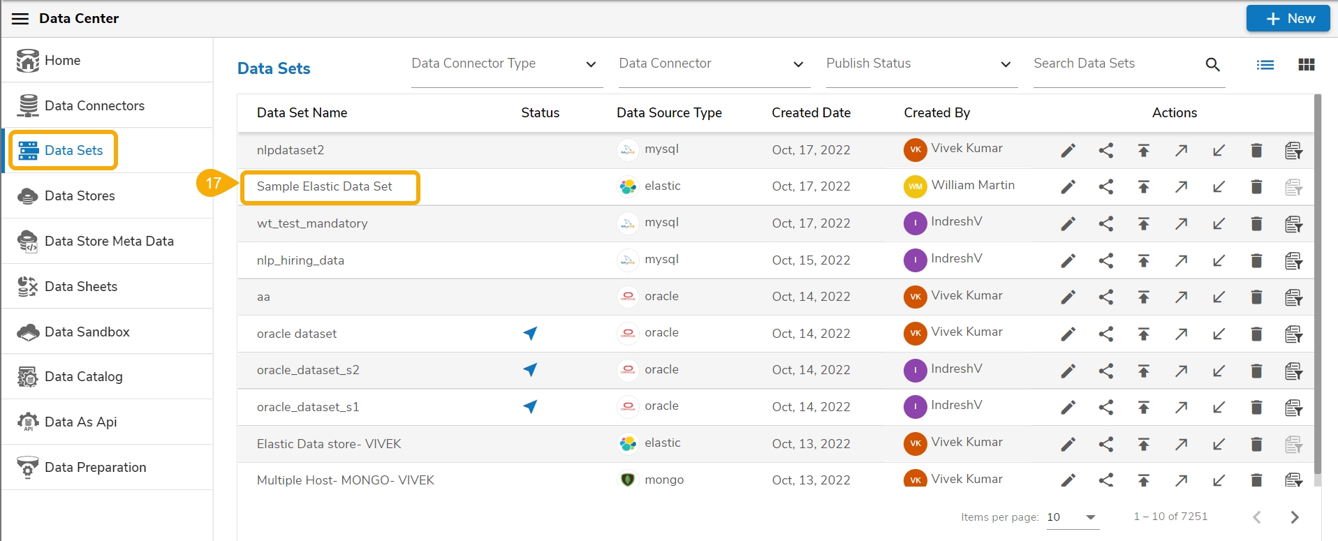 Select a Data Connector and click on the Create Data Set icon (E.g., the Elastic Connector is selected in the given image).