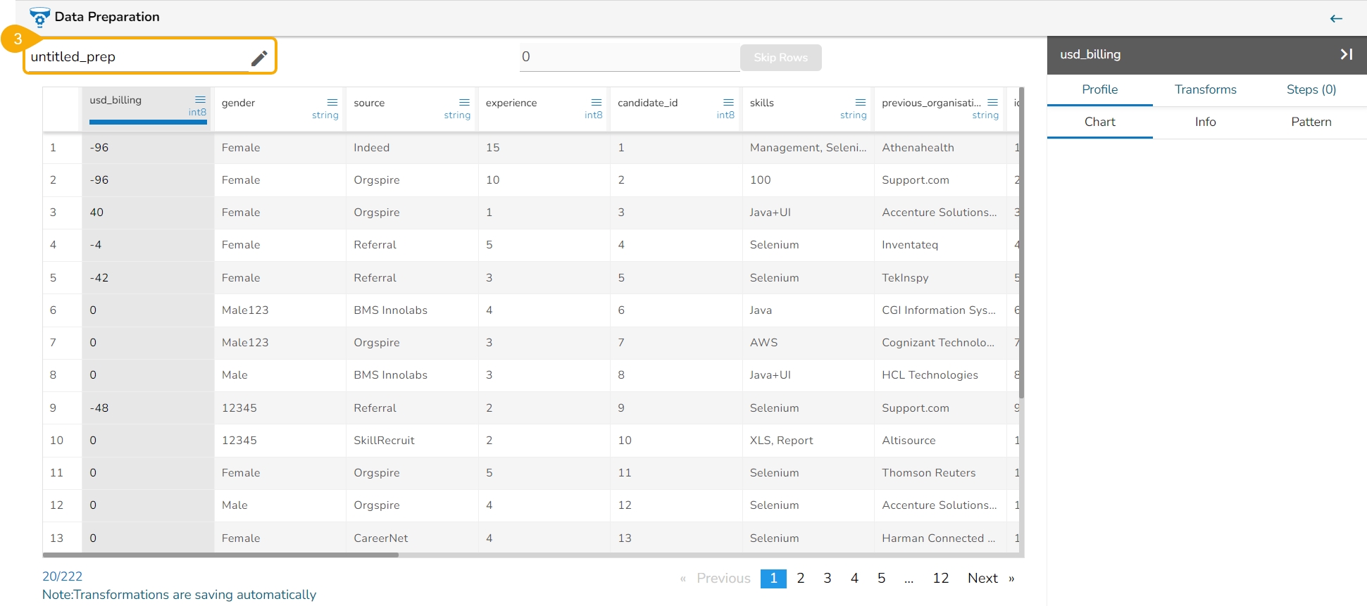Data from the selected Data Set gets displayed in the Data Preparation frame work.