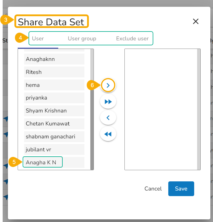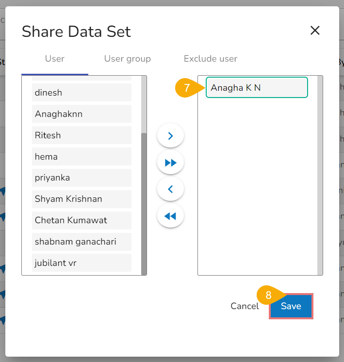 The Exclude User tab helps to exclude the user(s) from the rights to access a Data Set, if it is already shared. Only the users who are the part of the selected user group to which the Data Set has been already shared will list under the Exclude User tab.