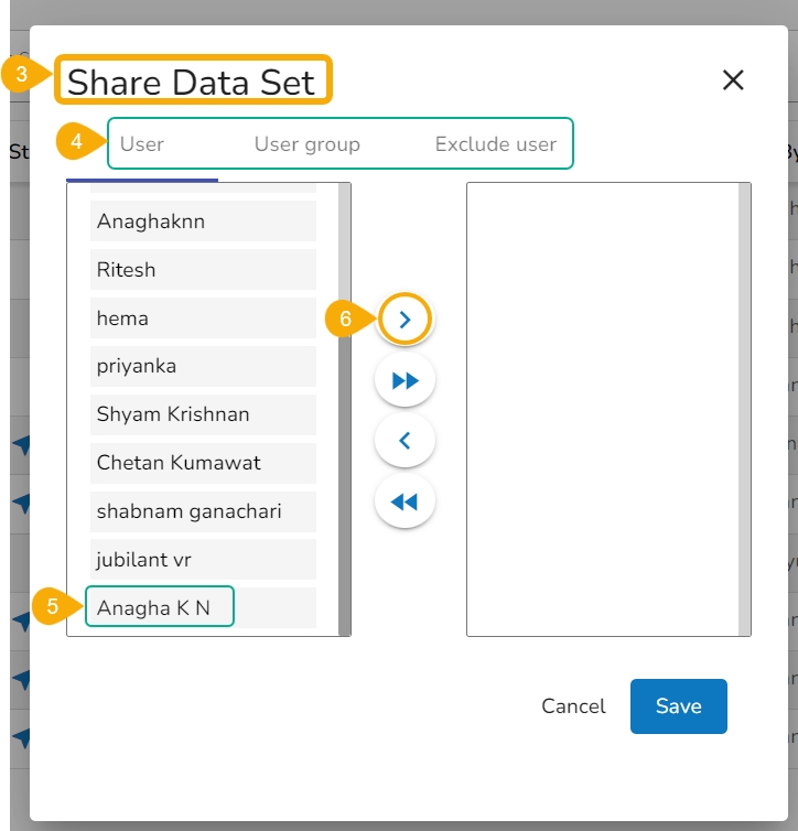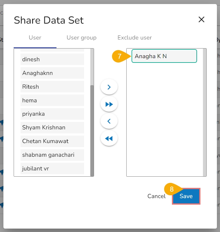 This option helps the user to share a Data Set with other user(s) or user group(s). The user can also exclude a user(s) or user group(s) from the rights to access a Data Set using the Exclude User option provided under the Share Data Set dialog box.