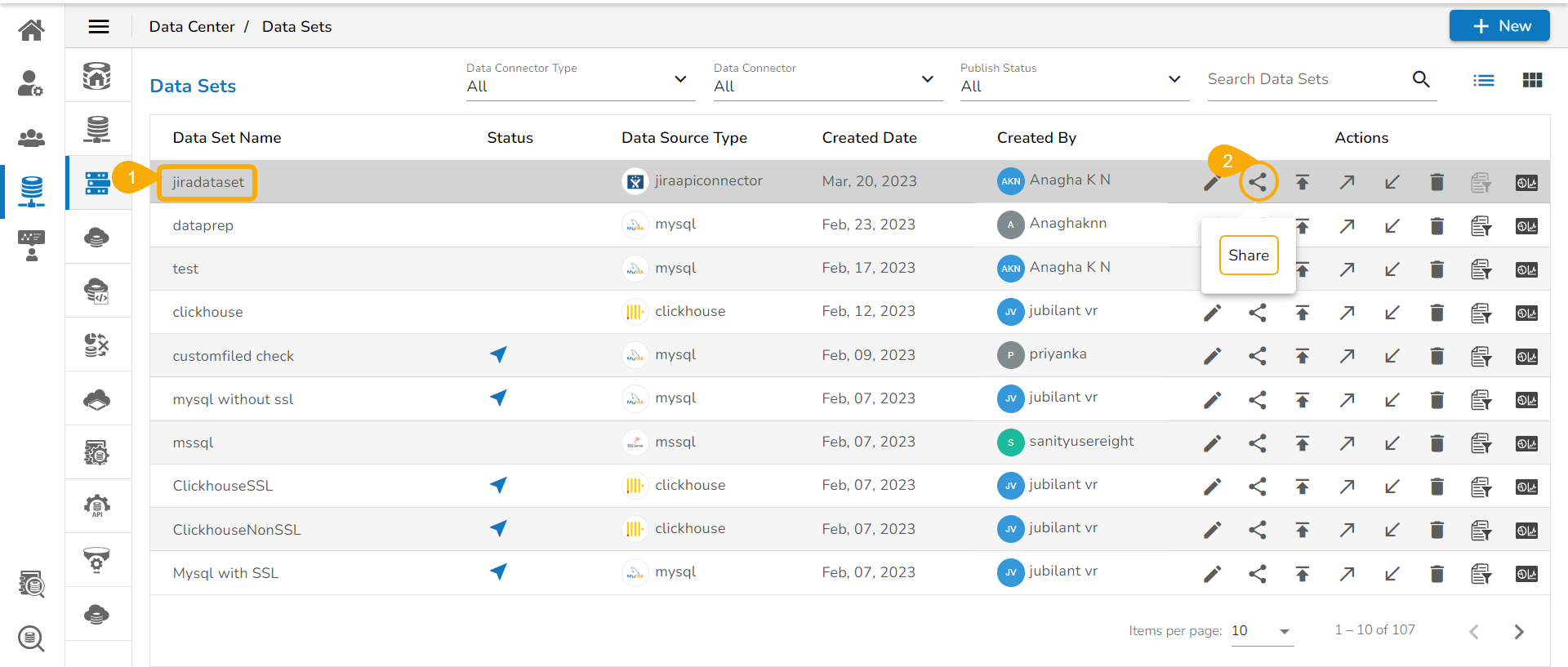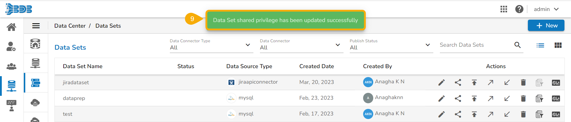 The shared Data Set gets listed under the Data Set List of the user to whom it has been shared.