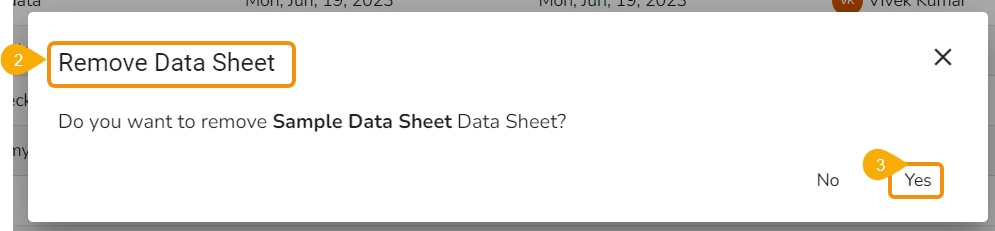 The Remove Data Sheet window opens to confirm the deletion of the selected Data Sheet.