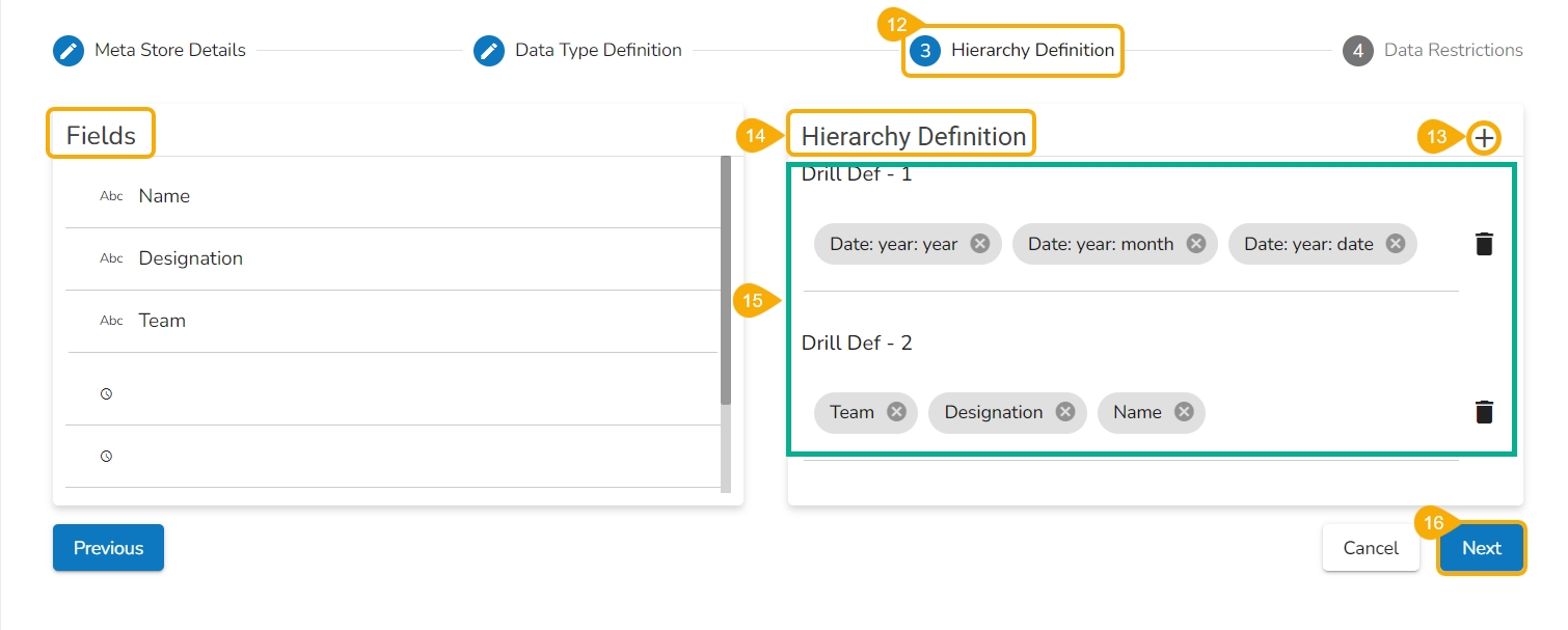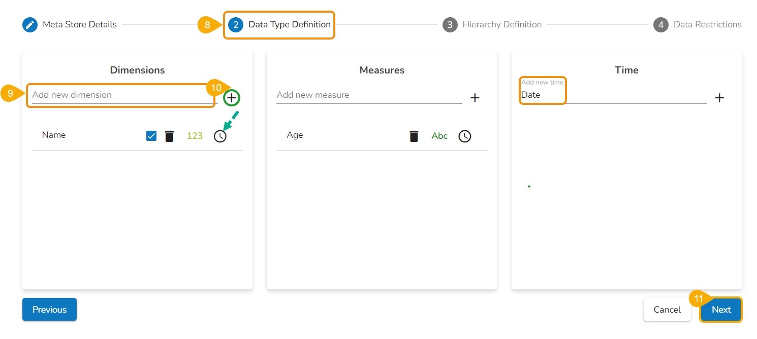 Use the Add icon to add the defined Dimension, Measure and Time values.