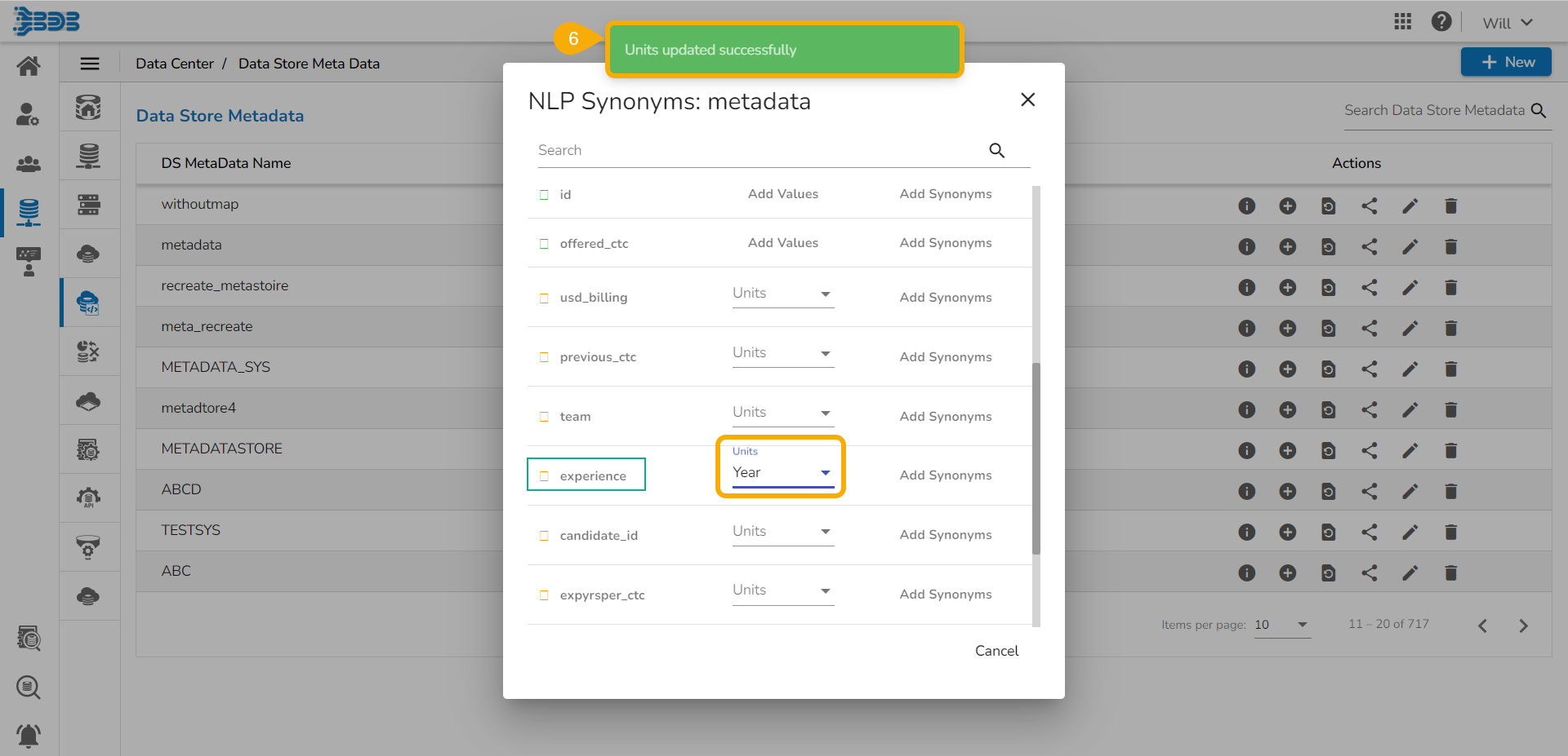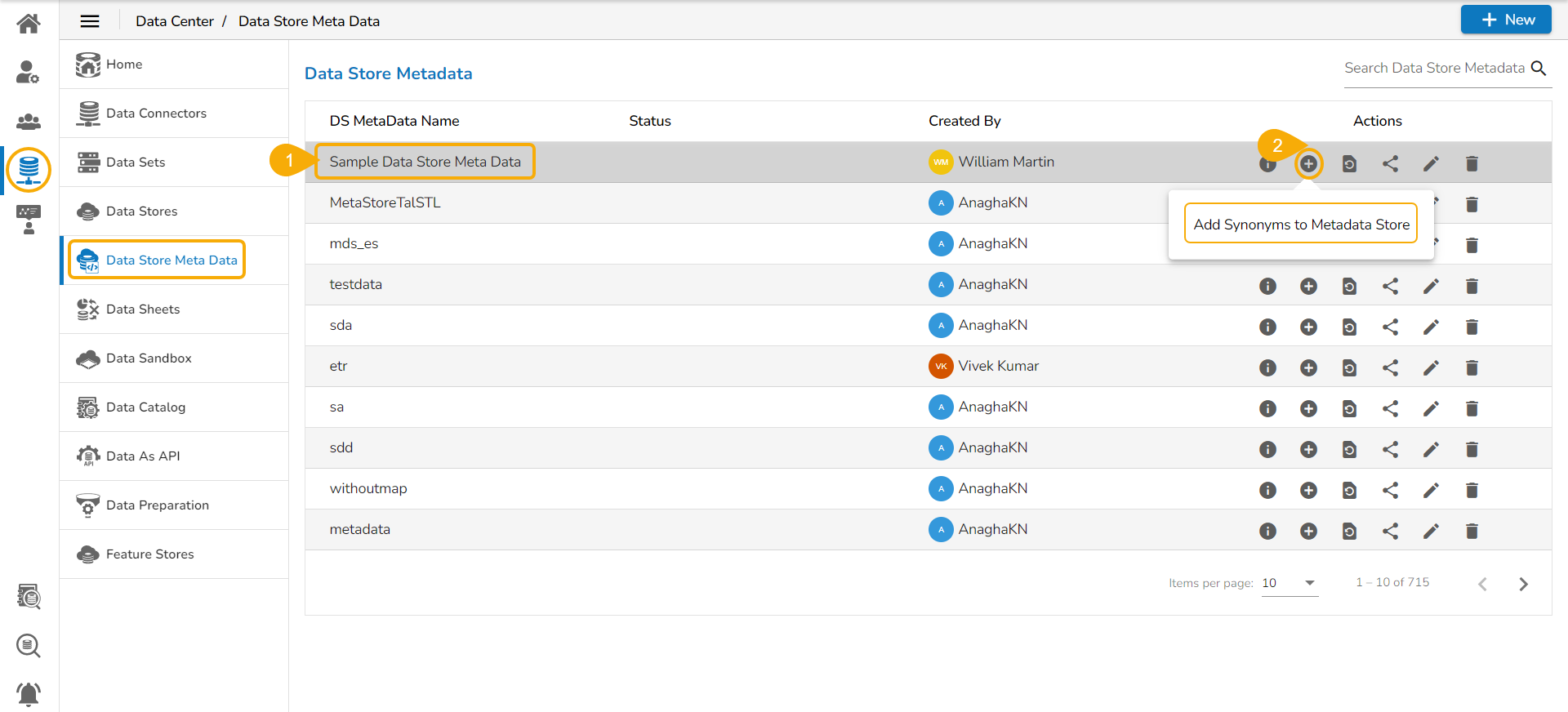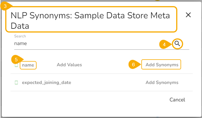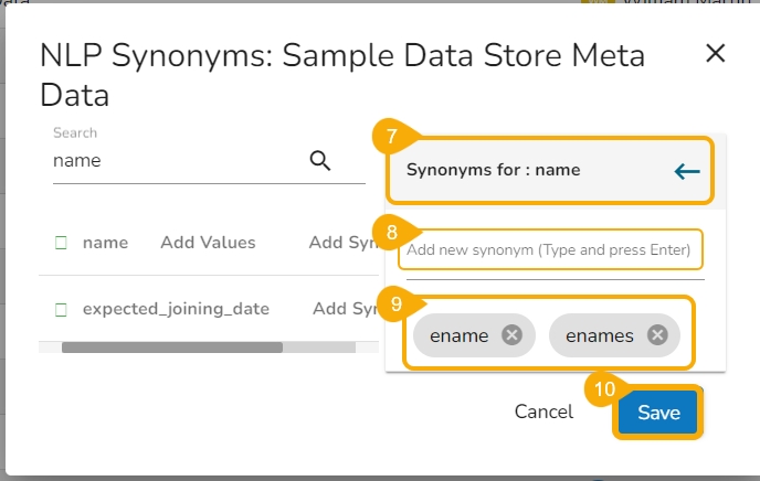 Navigate to the NLP Synonyms window for a Data Store Metadata.