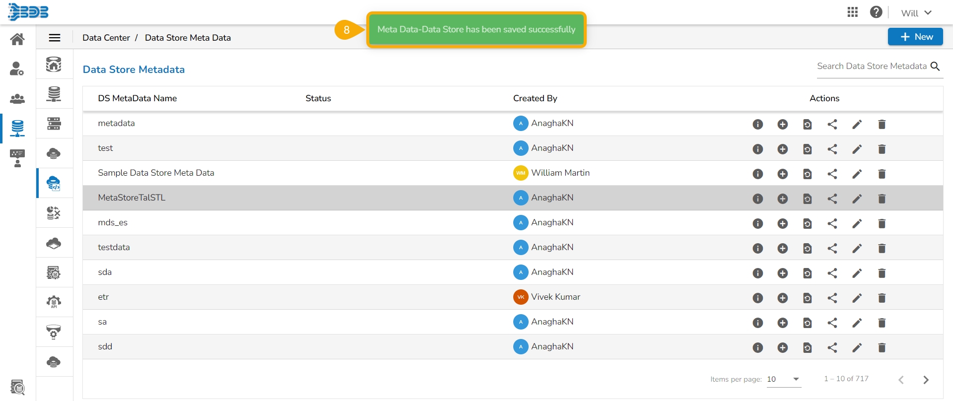 A confirmation message appears informing the successful user about the update of the selected Data Store Meta Data.