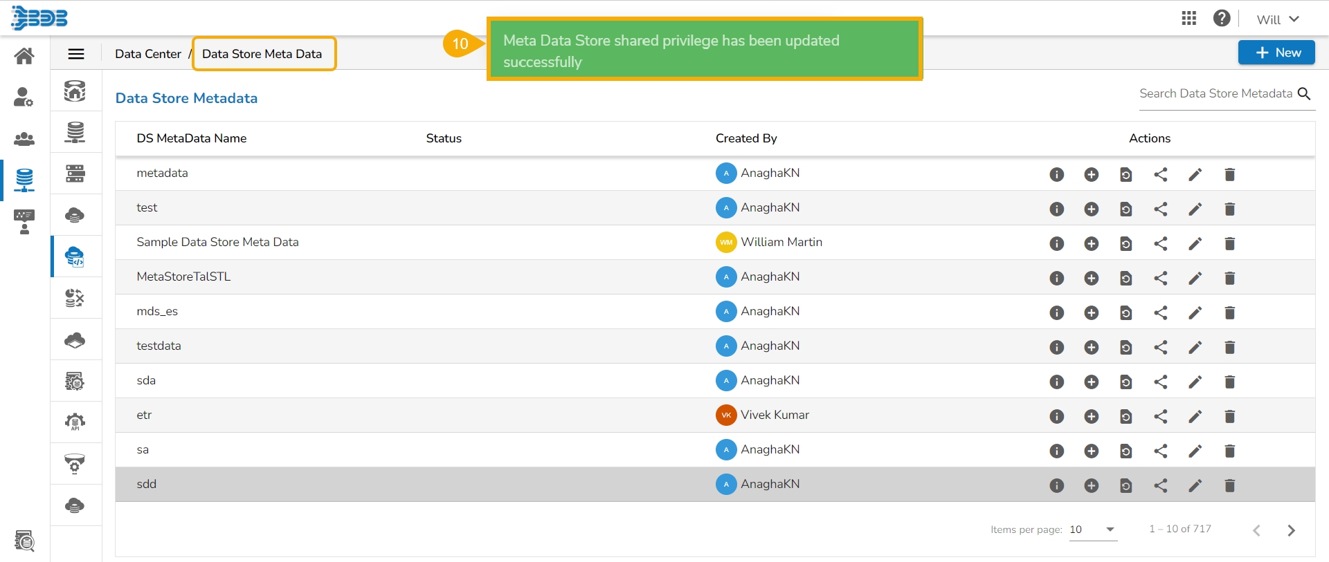 This option allows the user to share the specific Metadata Store from the available list of the Data Store Metadata with other users or user groups.