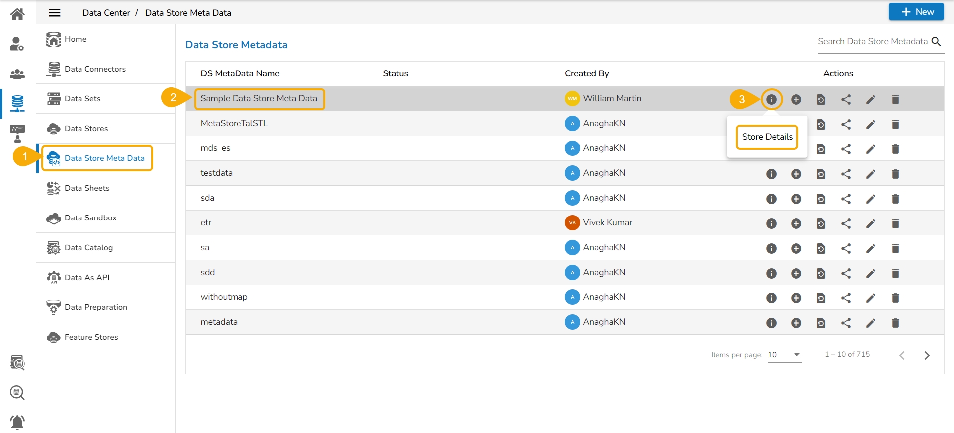 The Data Store Info drawer opens displaying the following details for the selected Metadata Store: