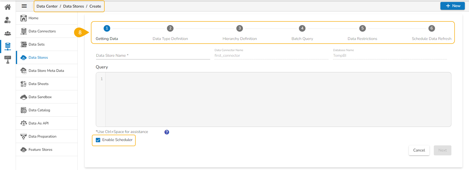 The Schedule Data Refresh step will appear only if the Enable Scheduler option is enabled from the Getting Data step. This step will not get displayed for the Data Stores based on Flat File data connectors or the Data Stores based on the uploaded CSV/Excel file.
