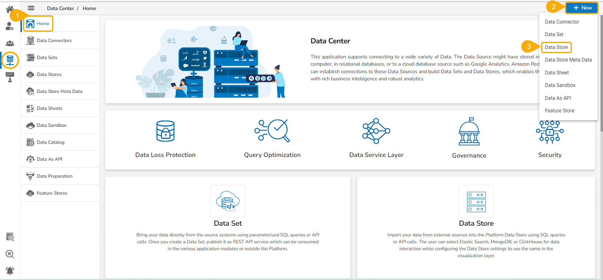 The user can create Data Store based on various data connectors using the Data Center module of the Platform. The major categories of the Data Store creation available on the platform are as follows: