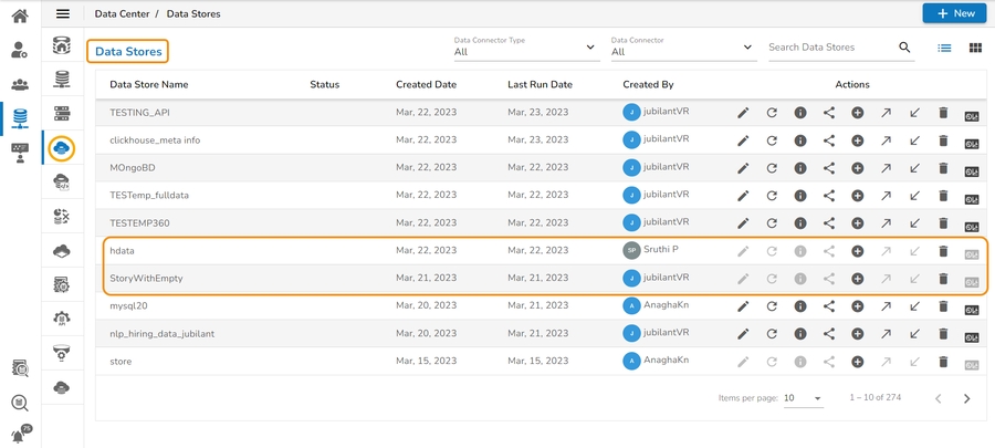 The user can also see the Data Stores created by Uploading a CSV/ Excel file for Creating a New Story getting listed on the Data Store List page.