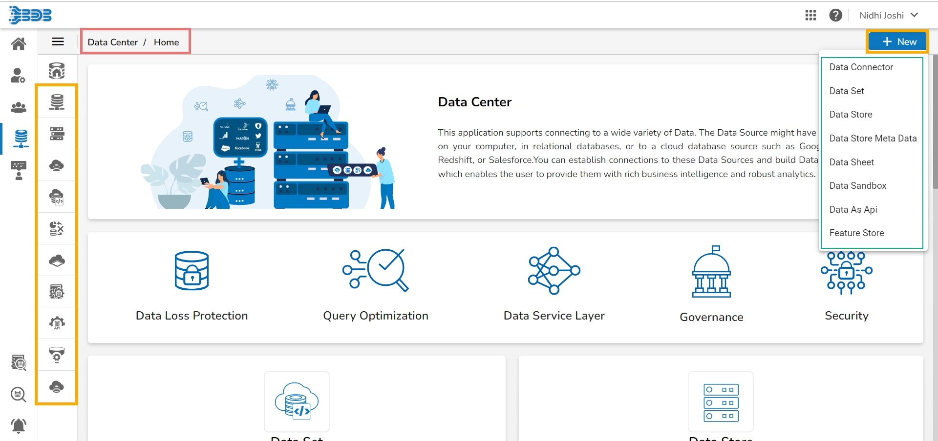 You can also access a menu bar with icons to get the lists of the created Data Connectors, Data Sets, Data Stores, Data Store Meta Data, Data Sheets, Data Sandbox, Data Catalog, and Data as API on the left side of the Data Center homepage.