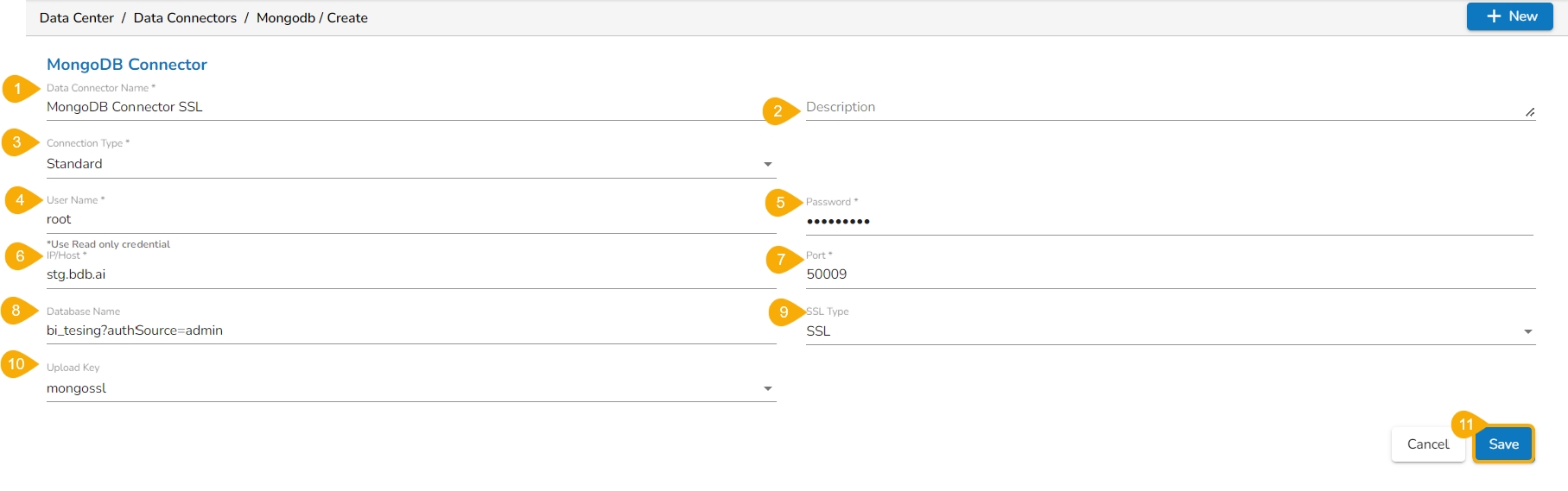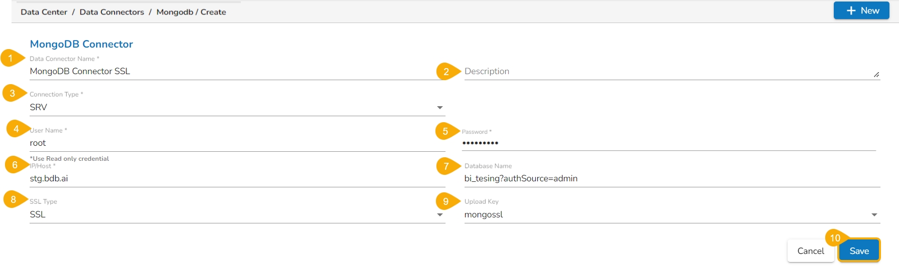 The following set of steps displays how to create a Mongo DB Data Connector: