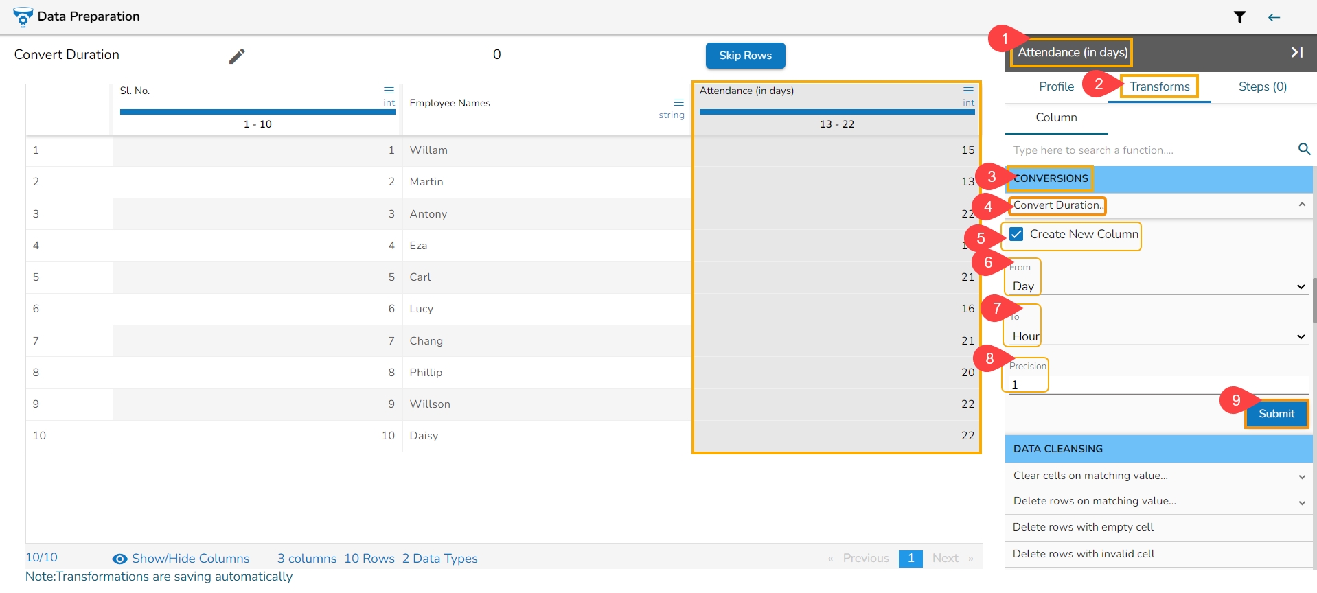 The selected column values undergo a transformation to align with the chosen conversion duration. E.g., For instance, in this scenario, the selected column values undergo a conversion, transitioning from the unit of days to hours.