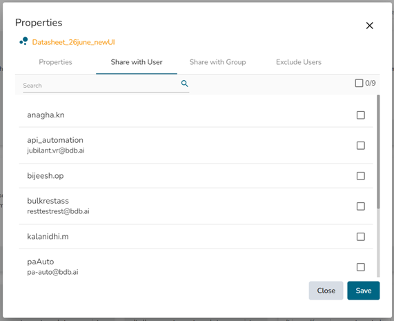 Shares the Data Set to the selected user(s) or group(s) or to exclude the selected user(s)/user group(s) from the rights to see a Data Set.