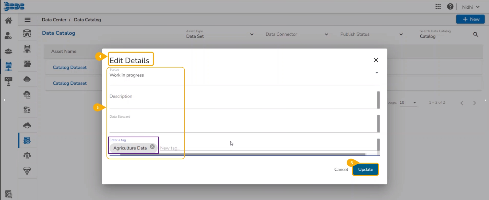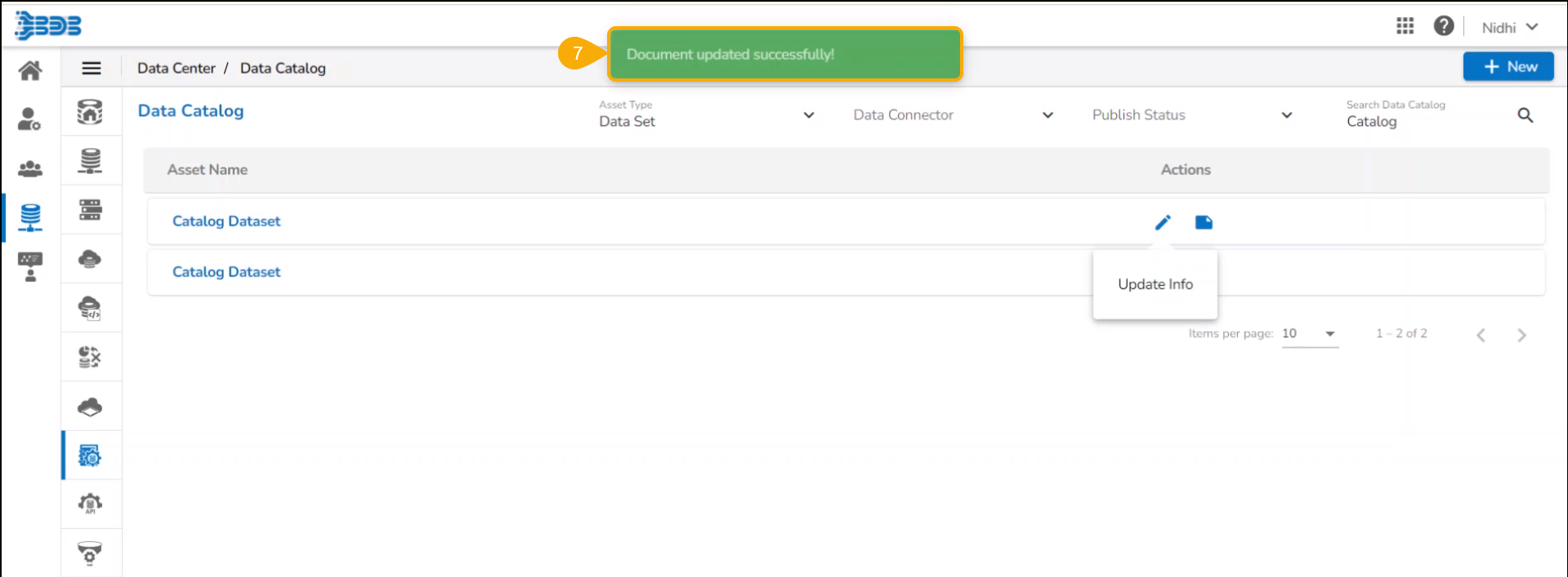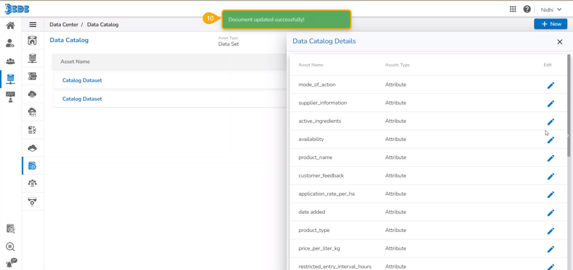 A confirmation message appears and the selected Data Catalog details get updated.
