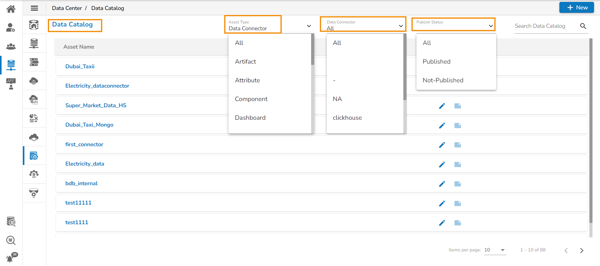 Status (appears only for the Data catalog that is filtered using the Data Connector or Dataset option)