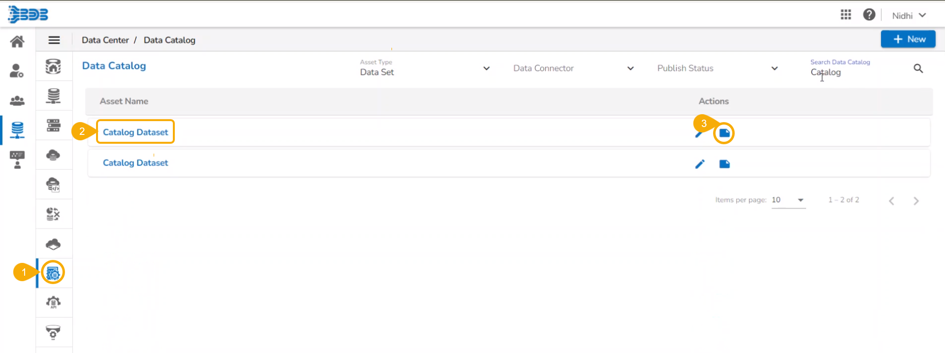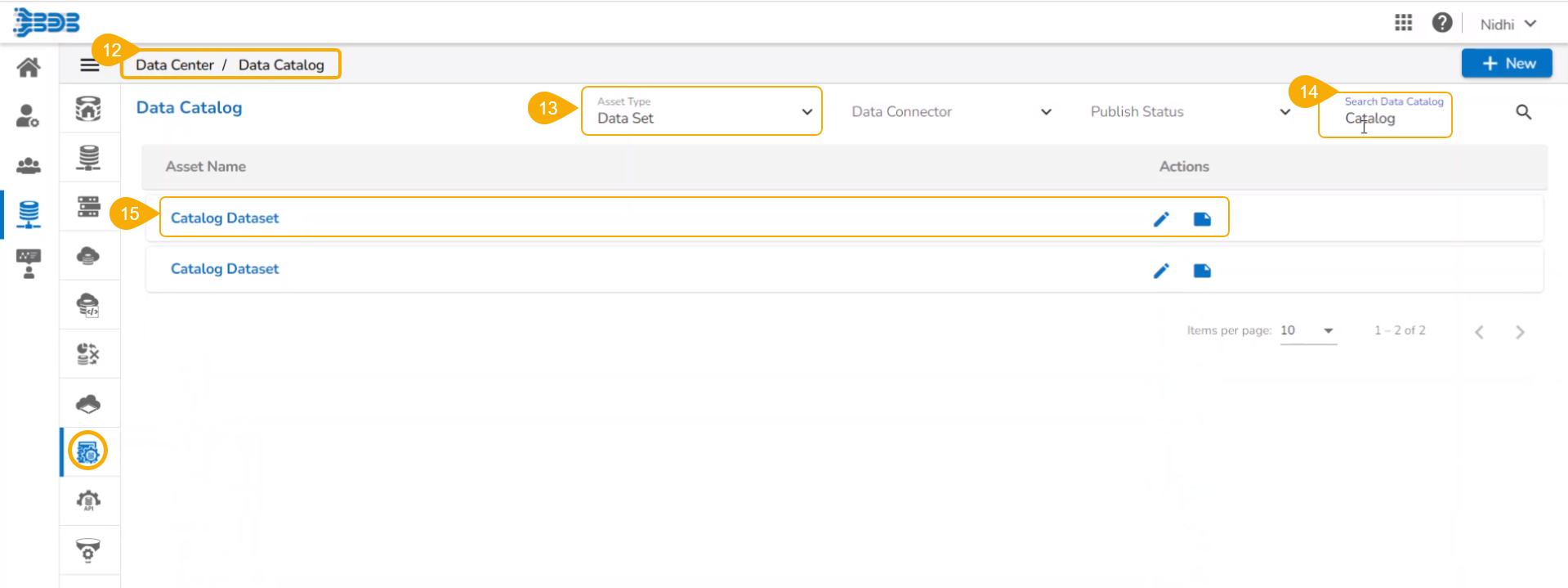 Please Note: The below-given explanation aims to show how Data Set as Asset Type provided for the Data Catalog list will reflect any newly added Data Set. The user can similarly search and list various Asset Types using the Data Catalog list.