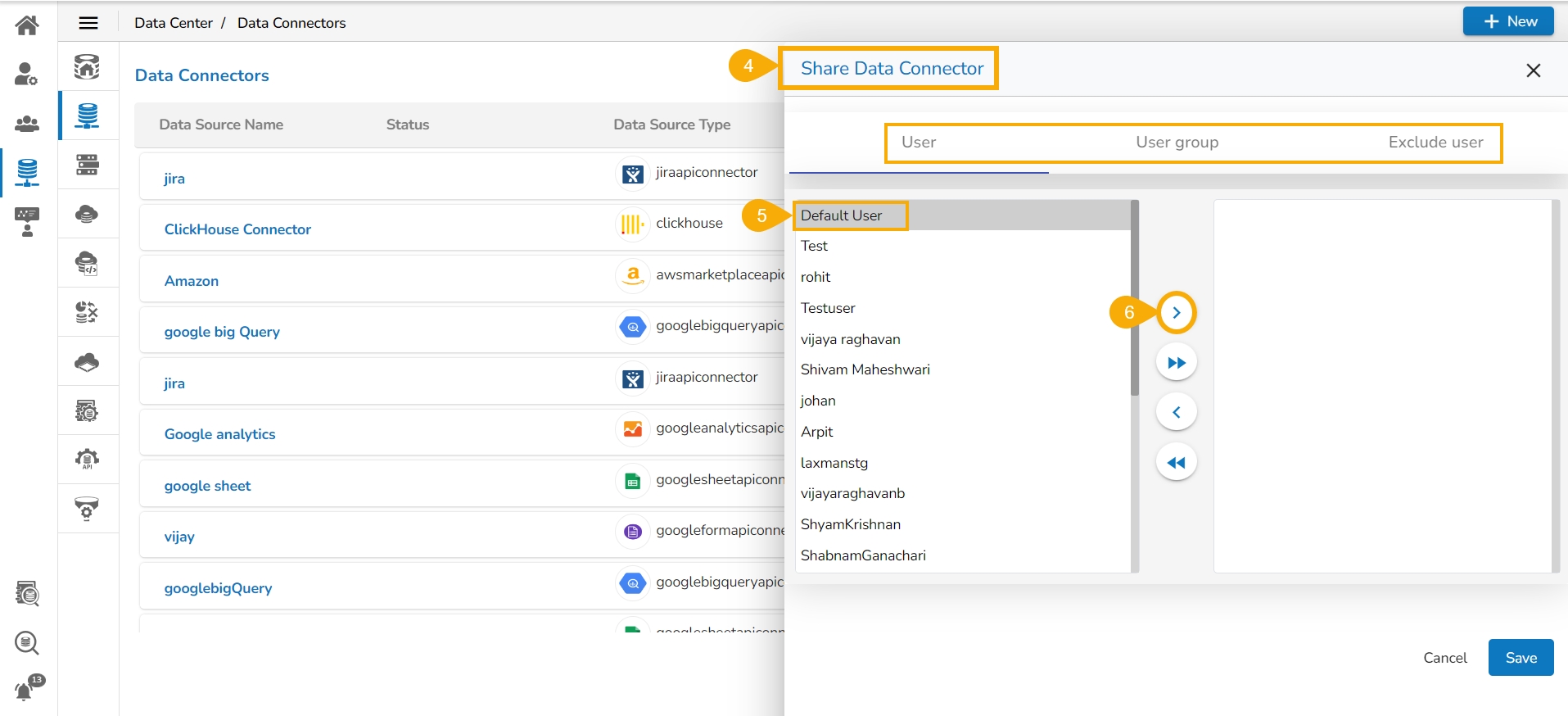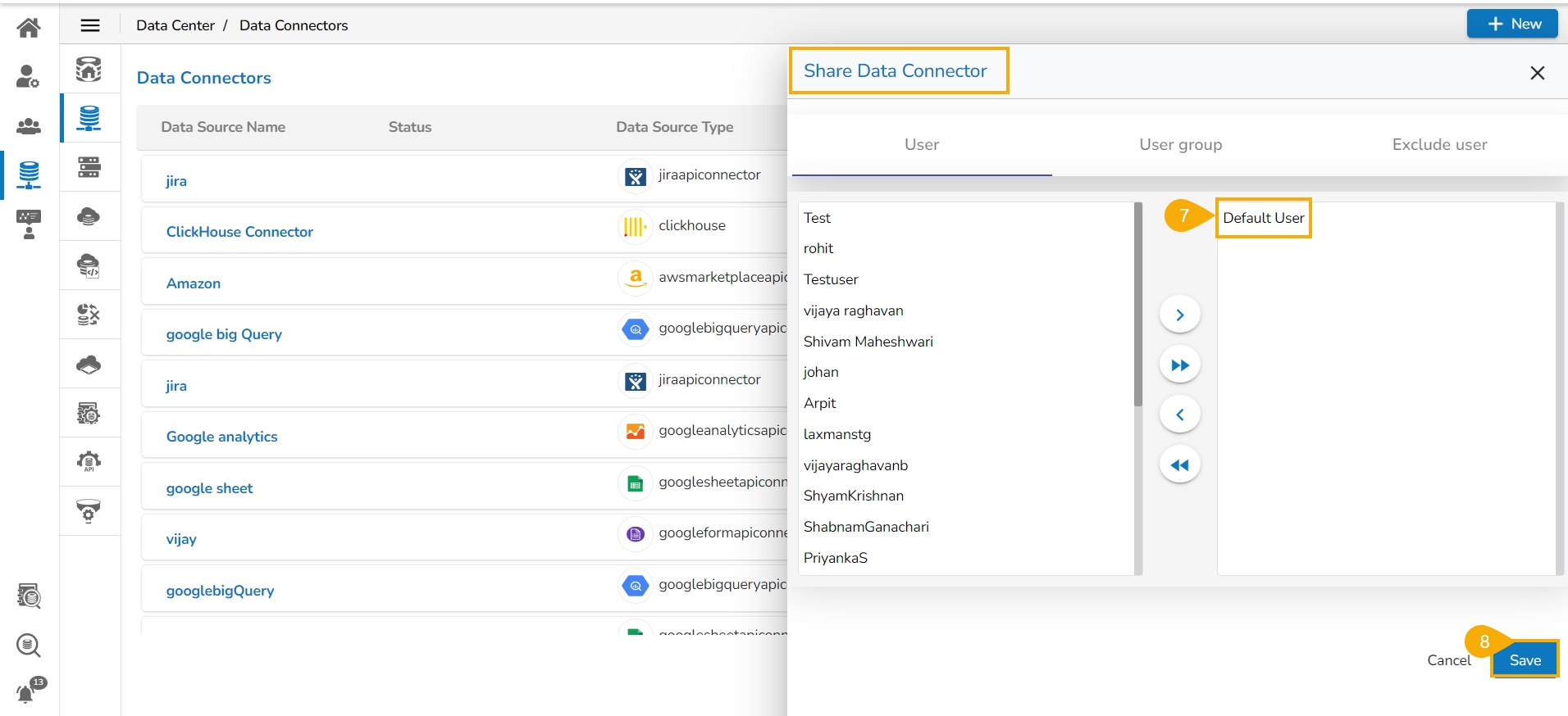 This option helps the user to share a Data Connector with other user(s) or user group(s). The user can also exclude a user(s) or user group(s) from the rights to access a Data Connector using the Exclude User option provided under the Share Data Connector dialog box.