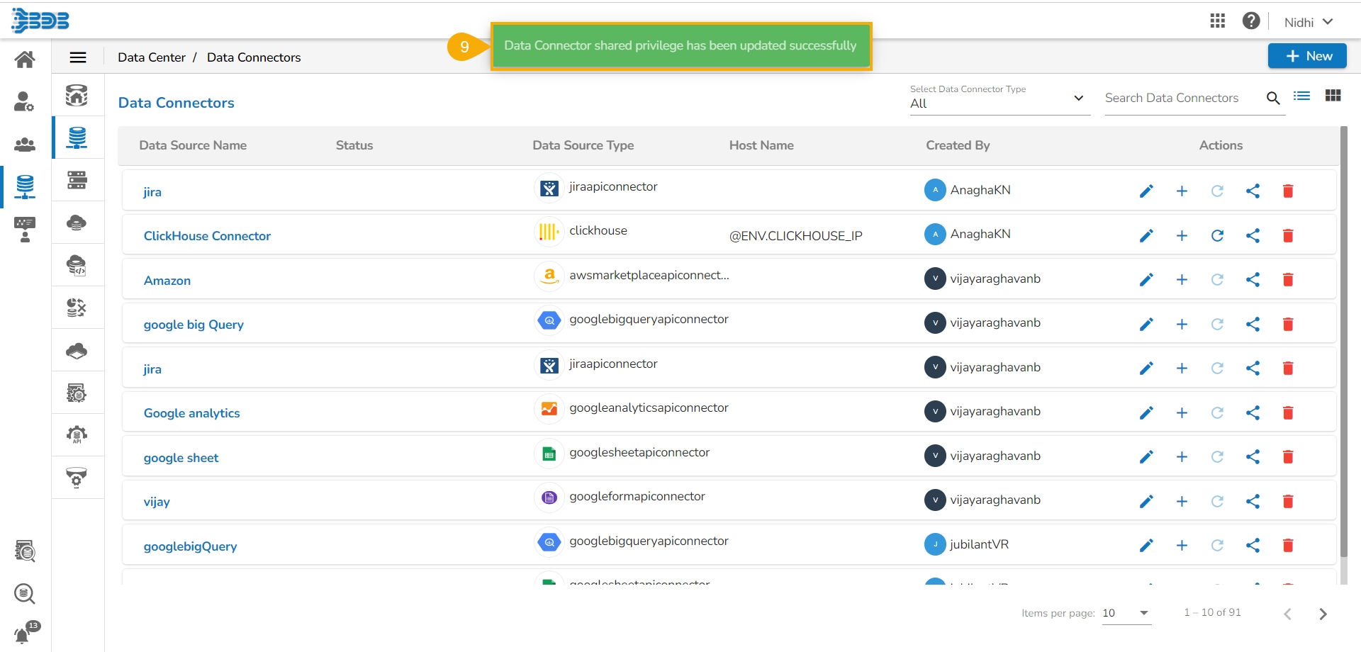 A confirmation message appears and the Data Connector gets shared with the selected user(s)/ user group(s).