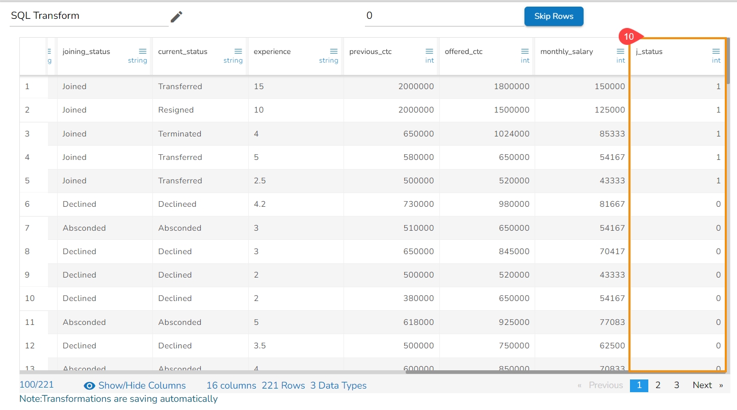 A new column gets added to the dataset reflecting the condition provided through the SQL transform.