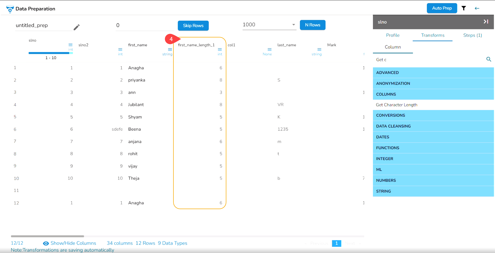Navigate to the Data Preparation page displaying data grid.
