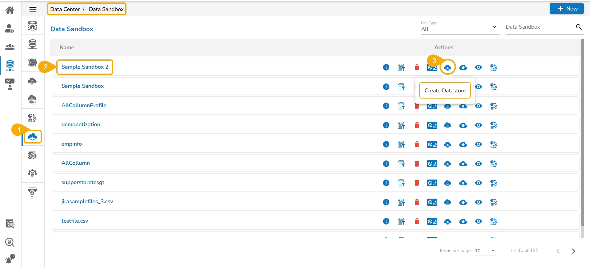 Click the Create Datastore icon for the selected Data Sandbox file.