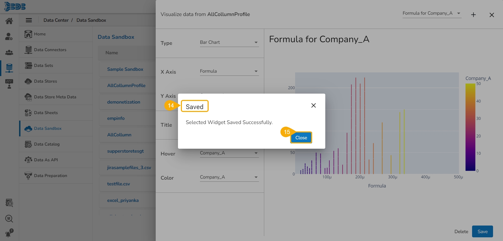 The saved widget can be seen in the drop-down while opening the Widget Visualizer next time for the same Data Sandbox.