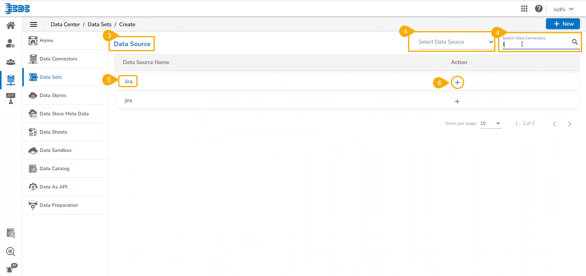 Use the Data Source filter or use Search Data Connectors space to access a specific data connector by its name (E.g., the data source list has been customized by putting the letter "J" in the Search Data Connectors space).