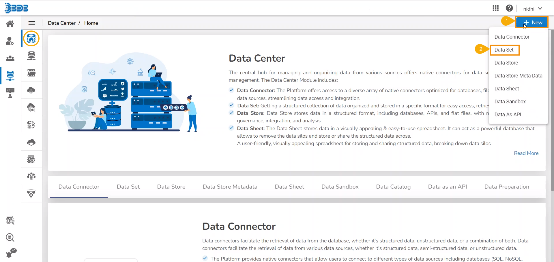 Click the New menu from the Data Center homepage.