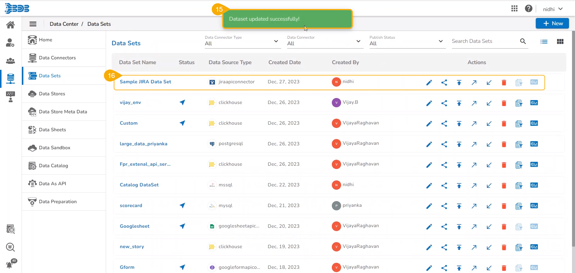 A success message appears to ensure the user about the completion of the Data Set creation task.
