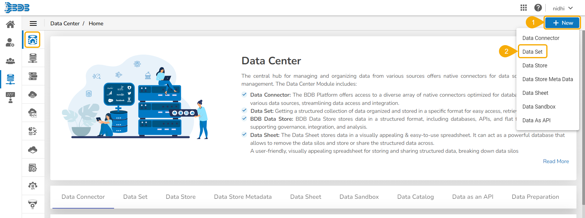 * Click the ***Create Data Set*** option for the selected Data Connector.