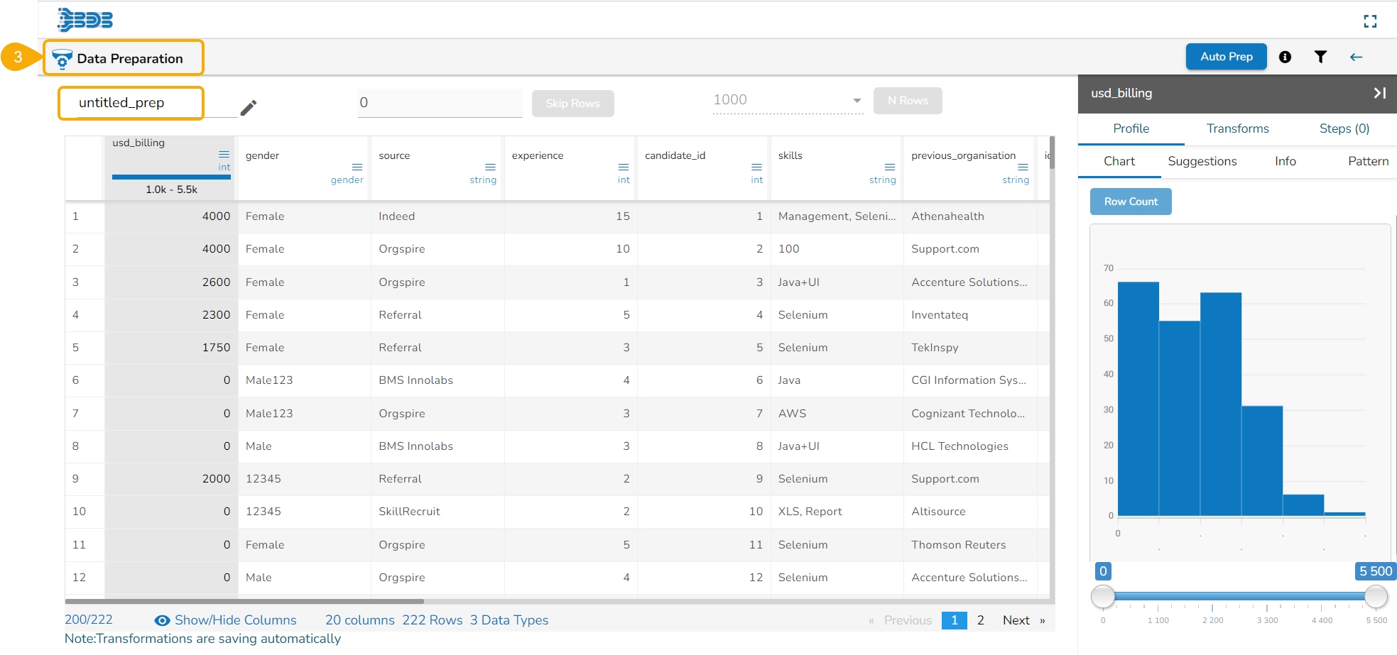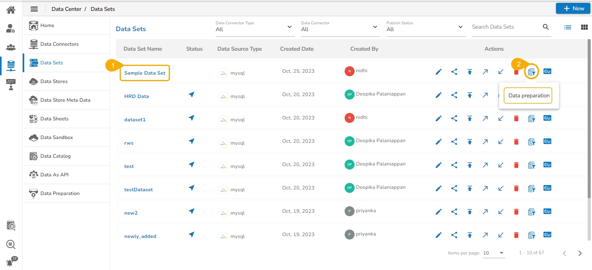 Data from the selected Data Set gets displayed in the Data Preparation frame work.