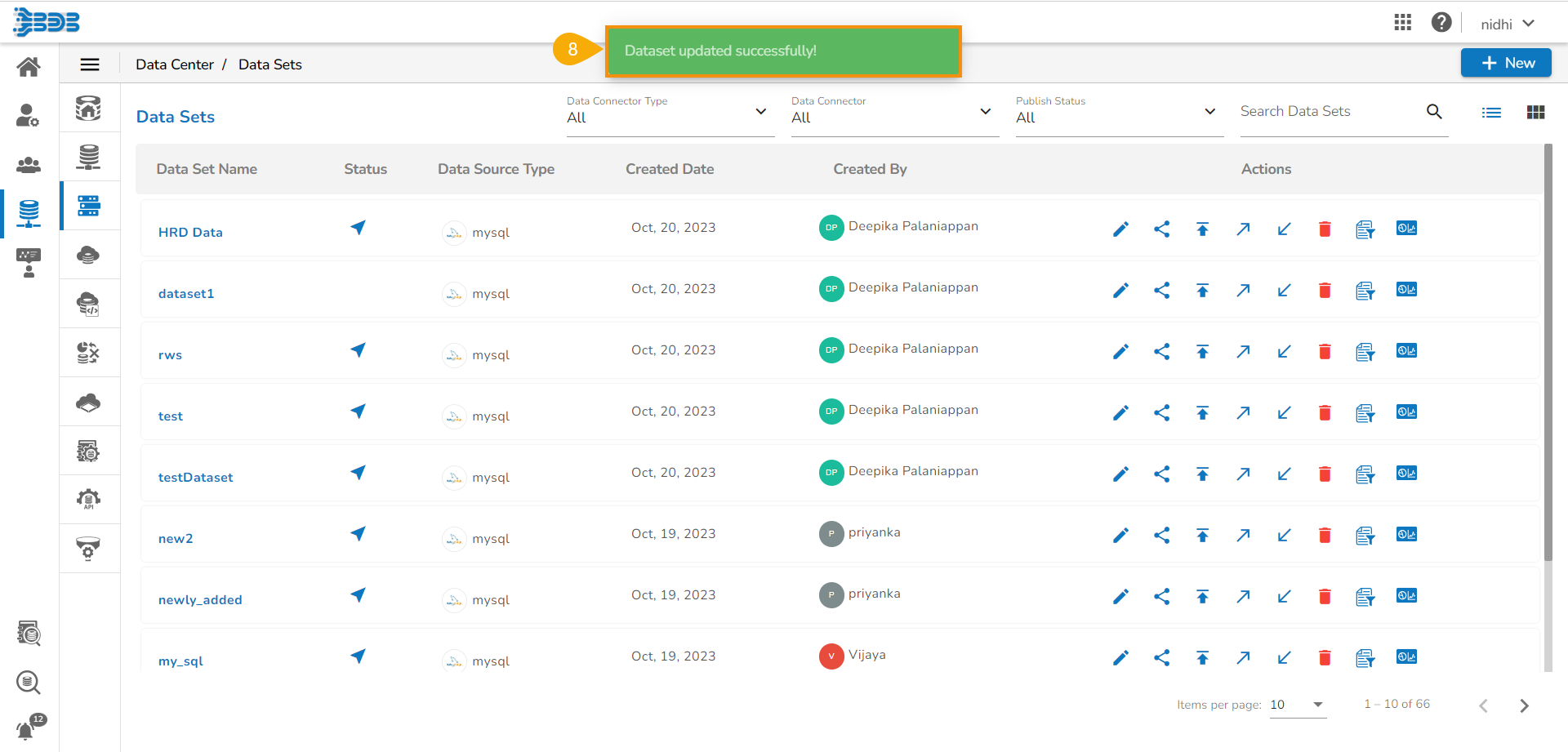 A confirmation message appears, and the selected Data Set gets updated.