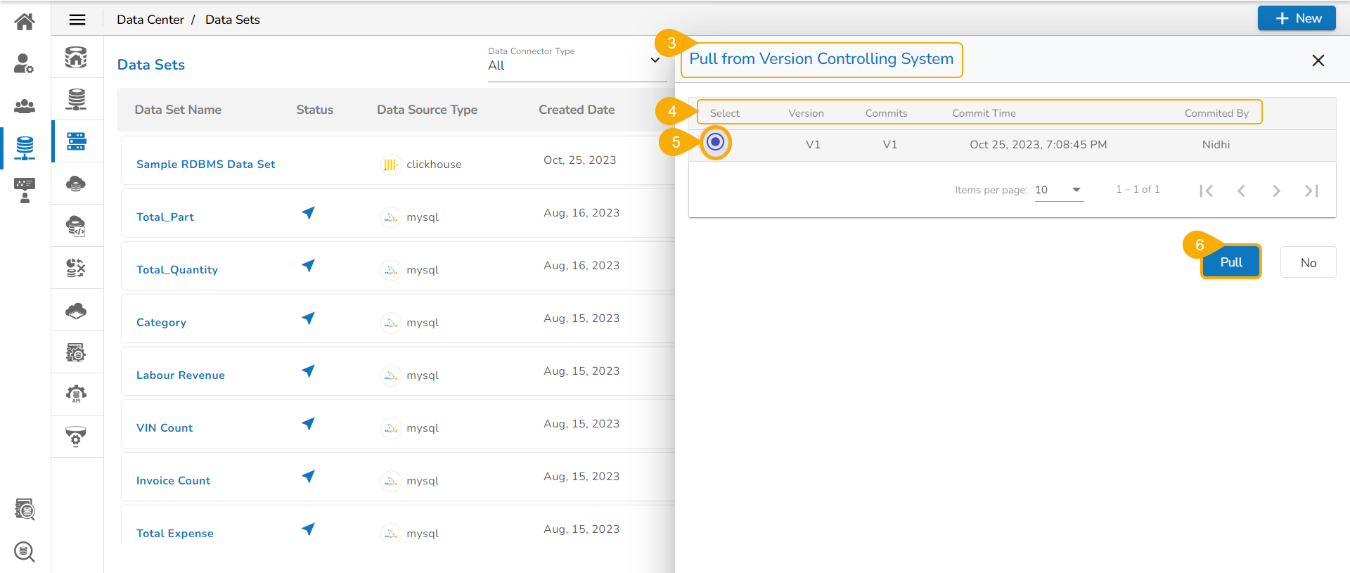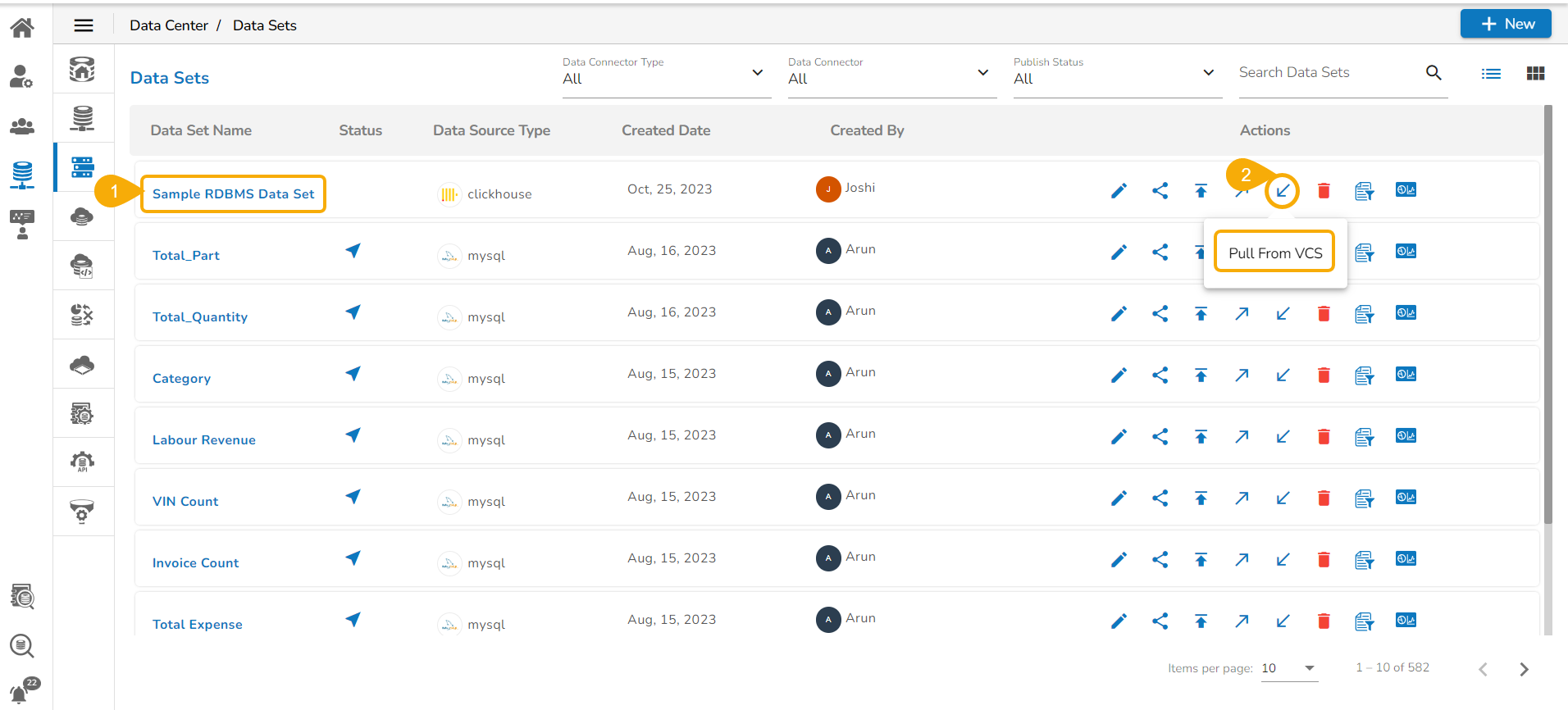 Click the Pull from VCS icon for a Data Set.