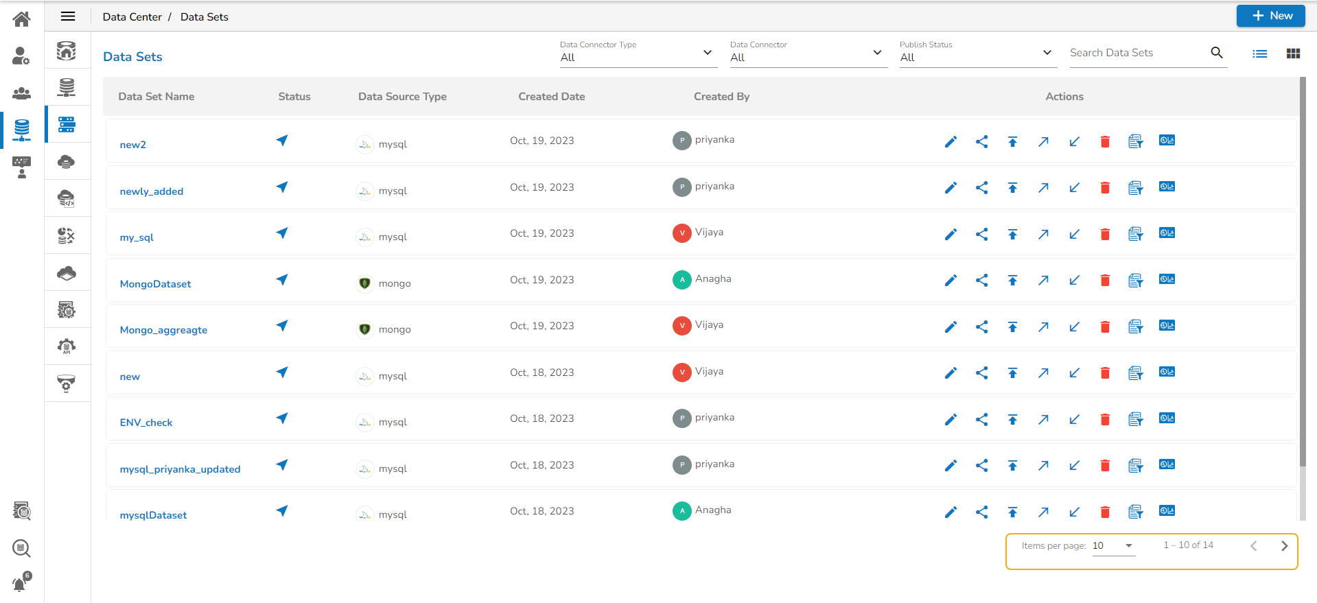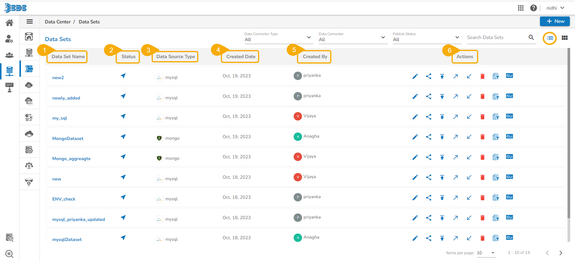 In the list view, there are five columns that contain data set information and action buttons as follows: