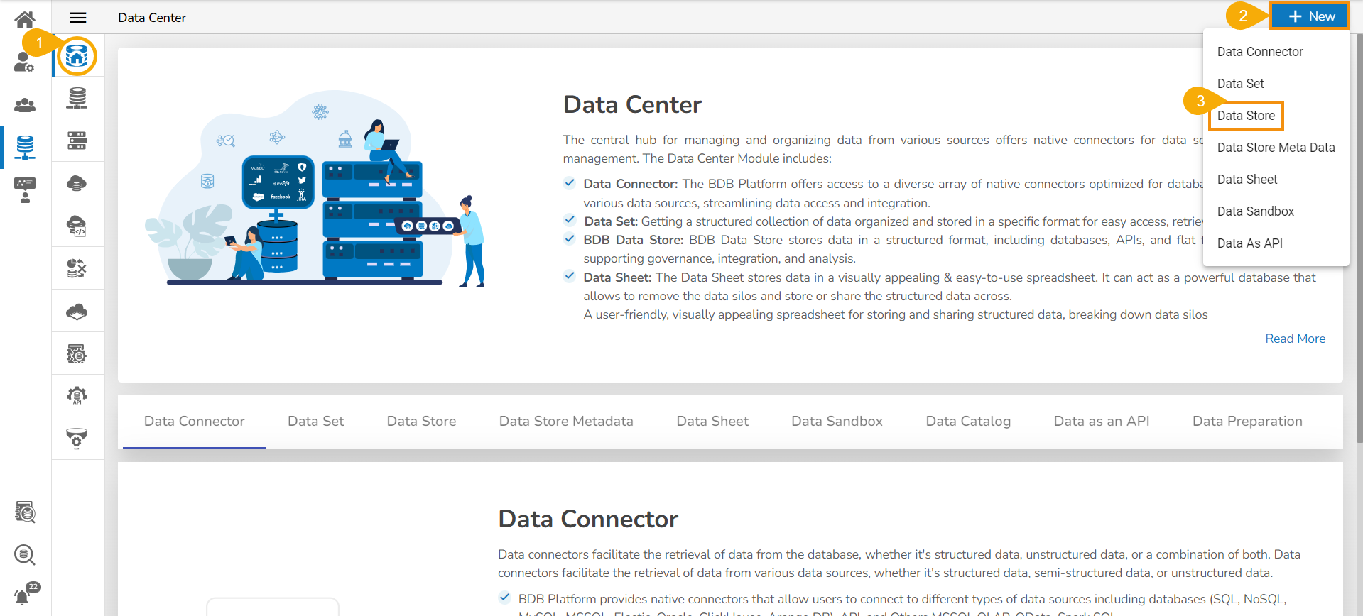 The user can create Data Store based on various data connectors using the Data Center module of the Platform. The major categories of the Data Store creation available on the platform are as follows: