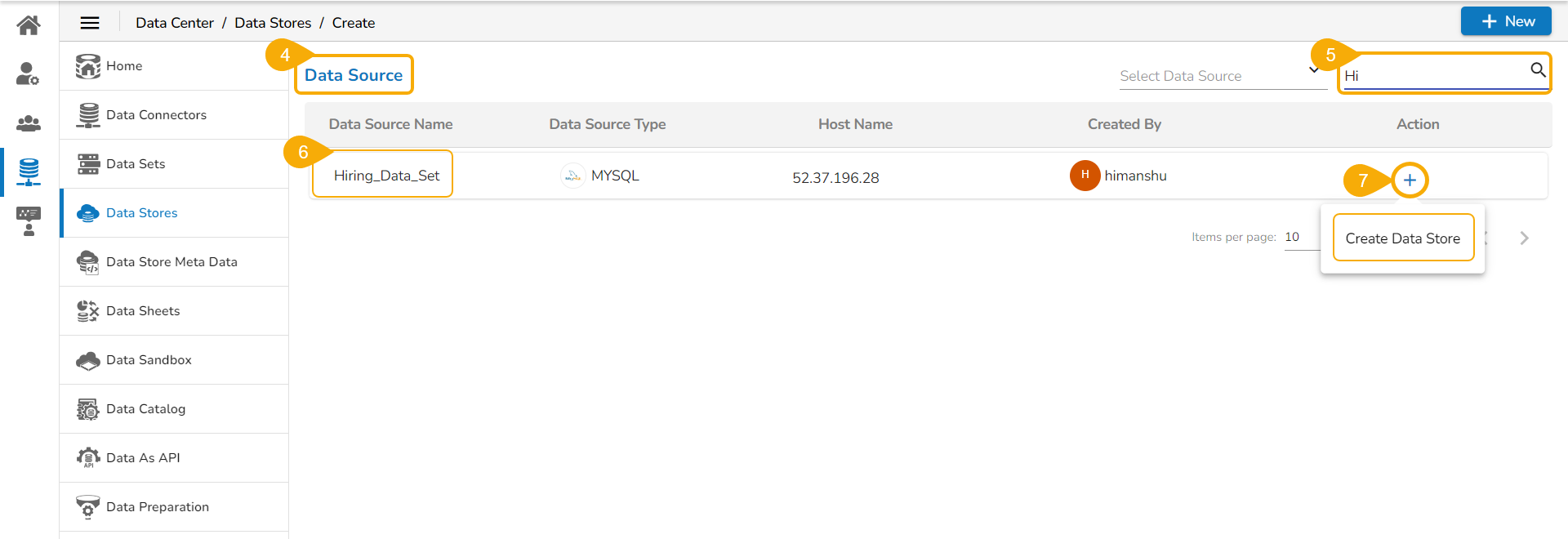 The user can create Data Stores based on various available Data Connectors from the Data Connectors list page or the Data Source page.